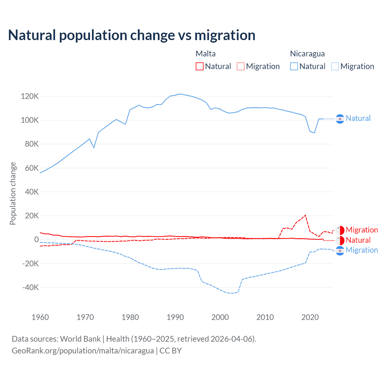 Over the last 10 years, 5.84% of the population change in Malta is from natural causes (a gain of 6,181 people) and 94.2% is from migration (a gain of 99,652 people). In Nicaragua 85.5% is from natural causes (a gain of 1,017,084 people) and 14.5% is from migration (a loss of 172,078 people).