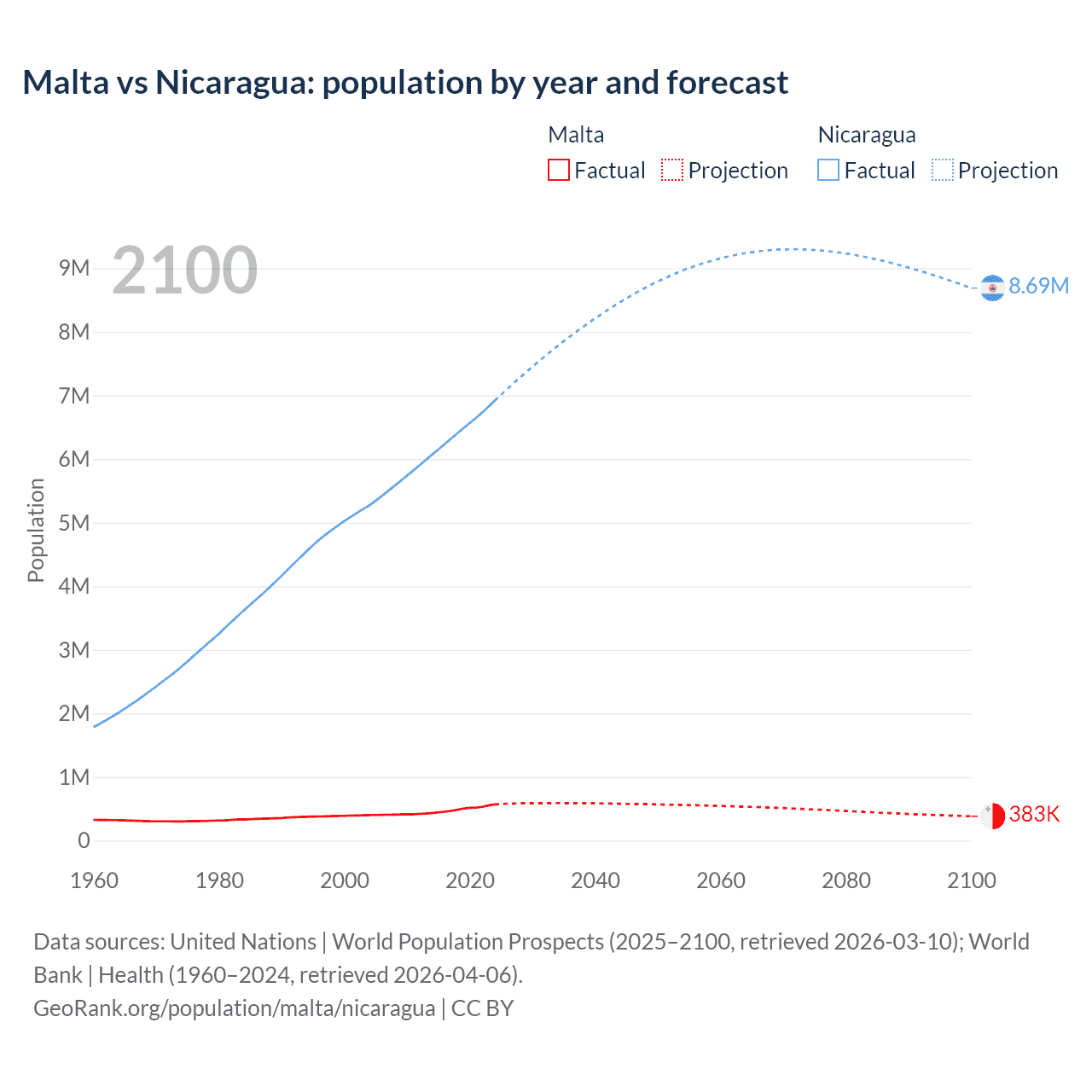 The latest officially reported population of Malta was 568,847 in 2024 vs 6,916,140 people in Nicaragua in 2024. In 2026, based on the adjusted UN estimation, the current Malta's population is 581,729 people compared to 7,124,343 in Nicaragua.