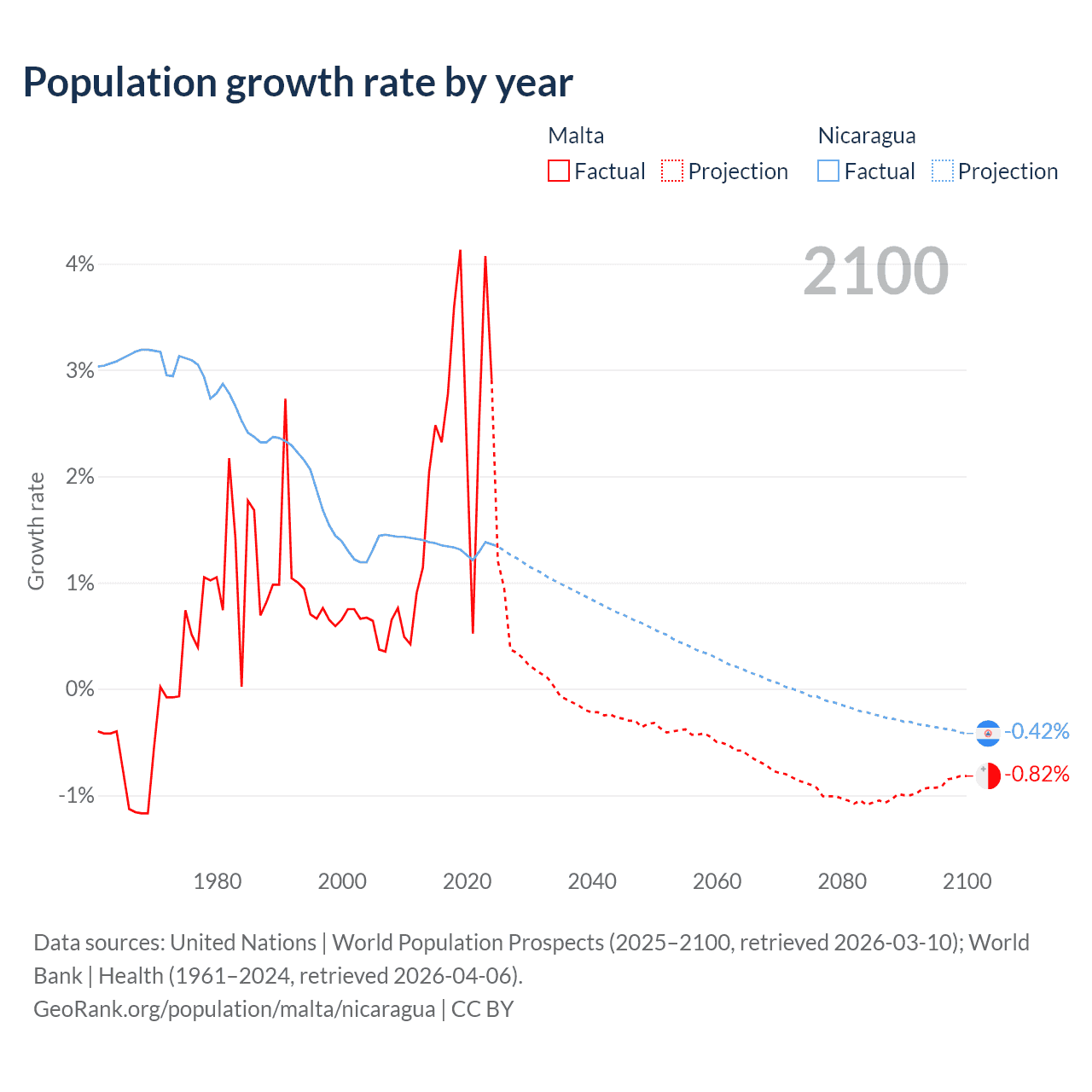 - For the last 10 years, Malta has had an average growth rate of +2.69% per year vs +1.33% in Nicaragua.