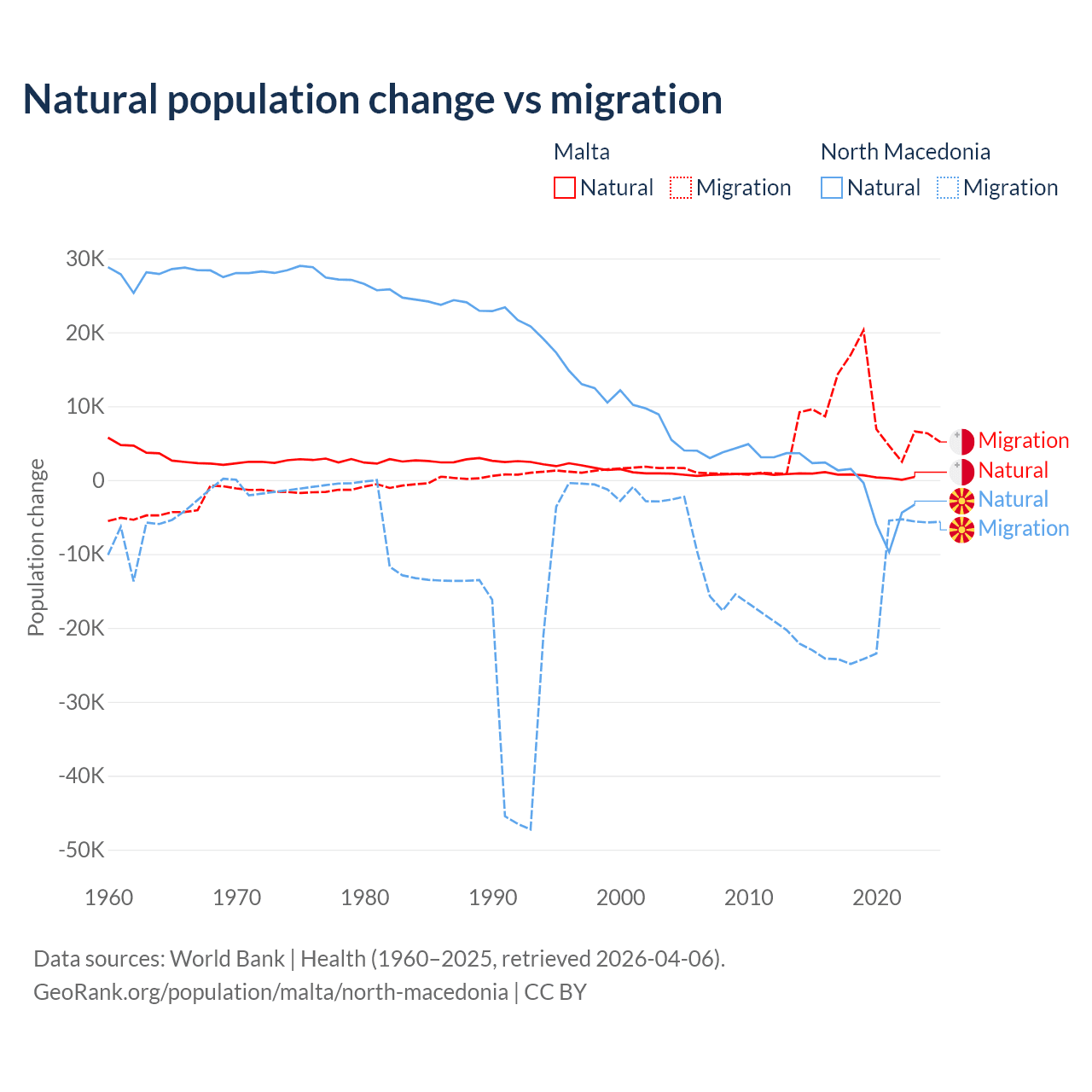 Over the last 10 years, 5.84% of the population change in Malta is from natural causes (a gain of 6,181 people) and 94.2% is from migration (a gain of 99,652 people). In North Macedonia 6.45% is from natural causes (a loss of 12,585 people) and 93.5% is from migration (a loss of 182,429 people).