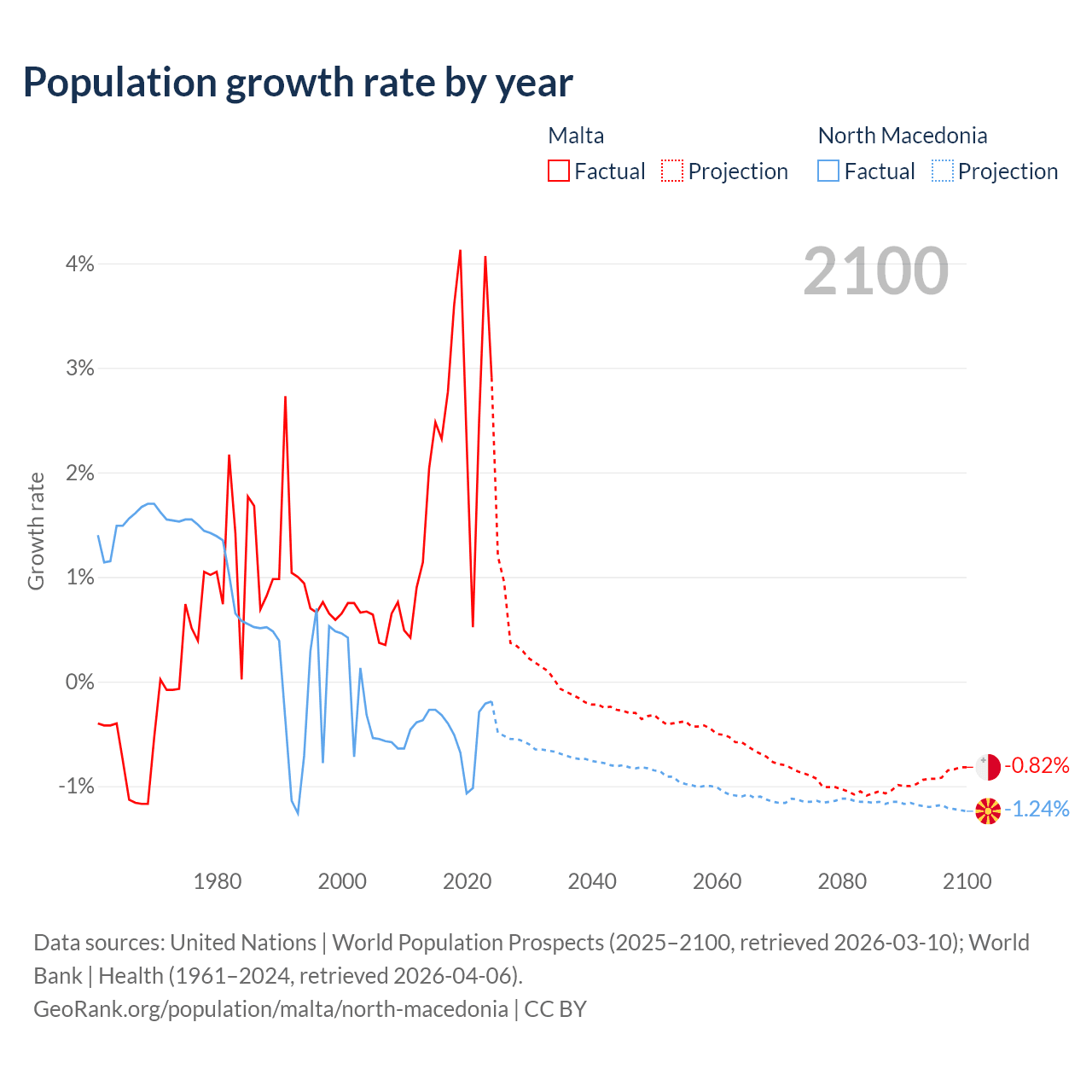 - For the last 10 years, Malta has had an average growth rate of +2.69% per year vs -0.48% in North Macedonia.