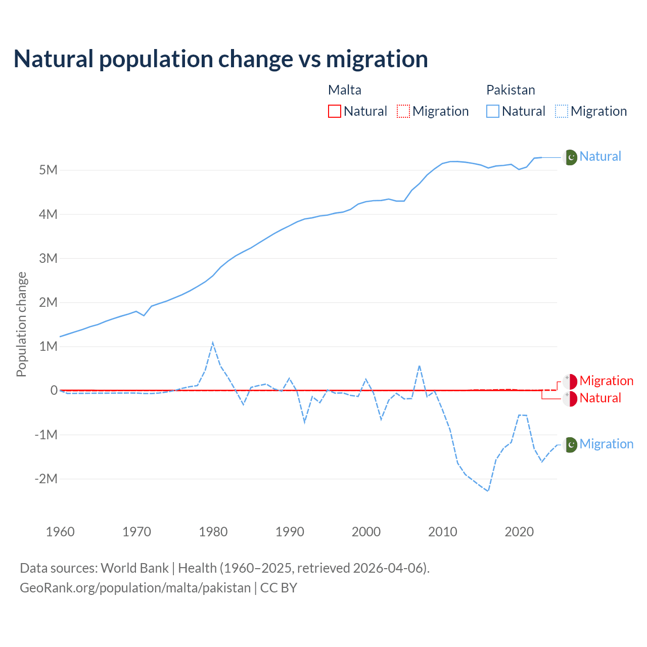 Over the last 10 years, 5.84% of the population change in Malta is from natural causes (a gain of 6,181 people) and 94.2% is from migration (a gain of 99,652 people). In Pakistan 77.8% is from natural causes (a gain of 51,255,404 people) and 22.2% is from migration (a loss of 14,629,055 people).