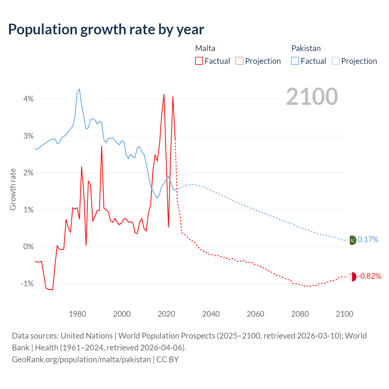 - For the last 10 years, Malta has had an average growth rate of +2.69% per year vs +1.6% in Pakistan.