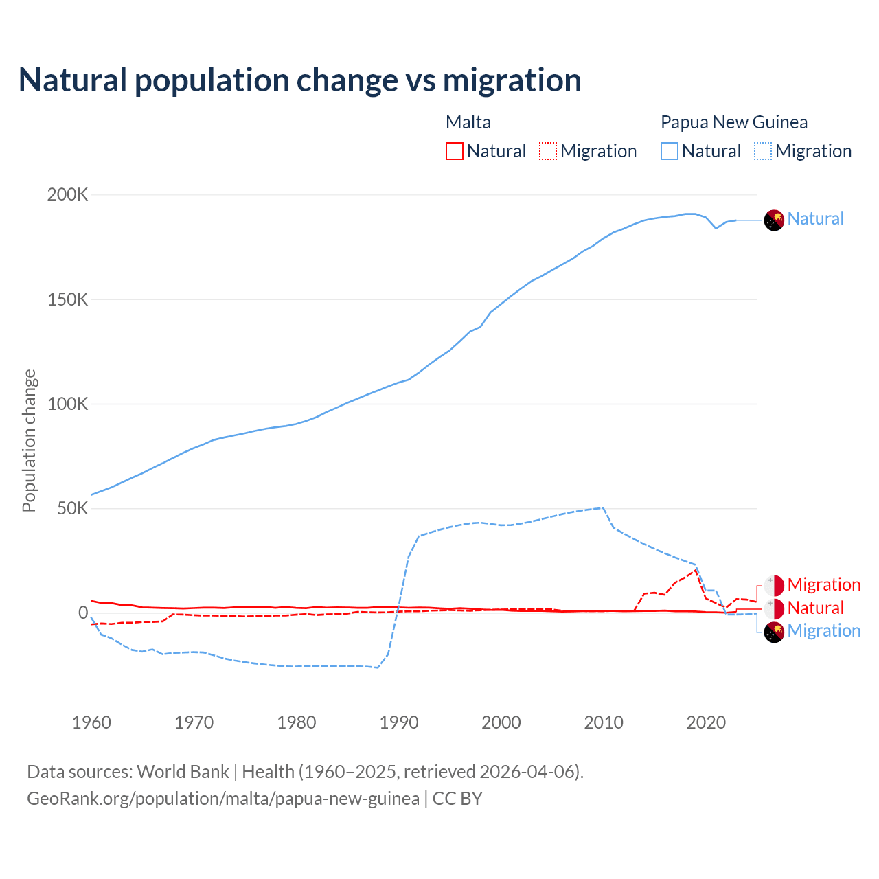 Over the last 10 years, 5.84% of the population change in Malta is from natural causes (a gain of 6,181 people) and 94.2% is from migration (a gain of 99,652 people). In Papua New Guinea 91% is from natural causes (a gain of 1,883,906 people) and 8.98% is from migration (a gain of 185,900 people).