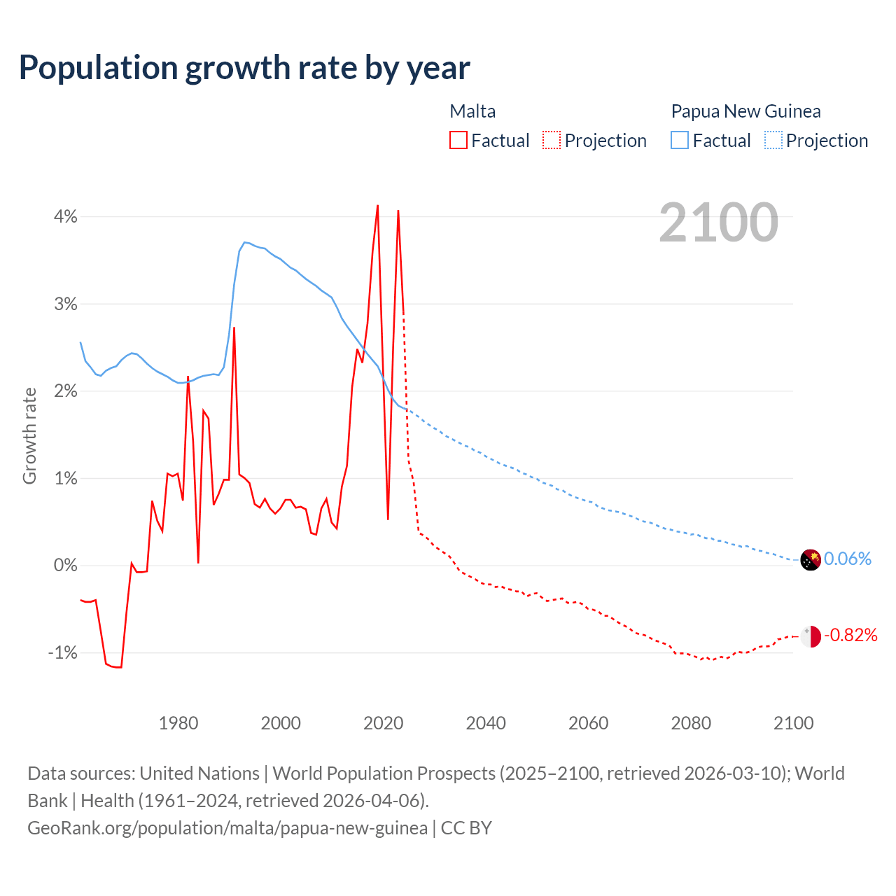 - For the last 10 years, Malta has had an average growth rate of +2.69% per year vs +2.23% in Papua New Guinea.