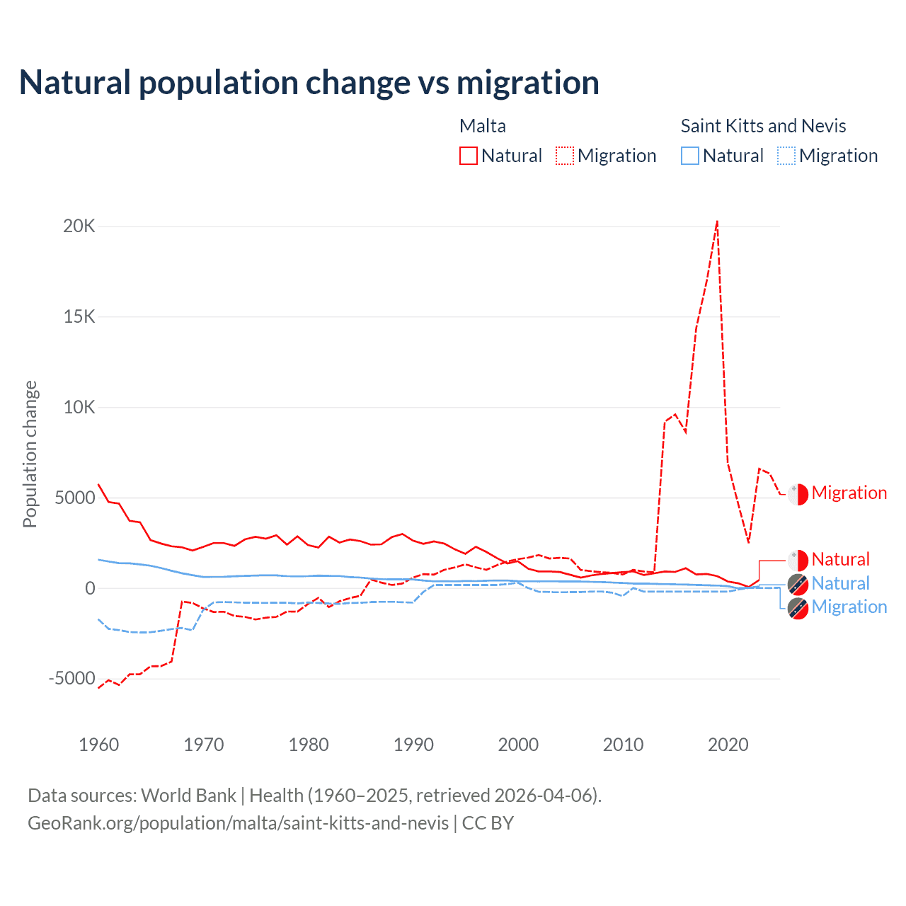 Over the last 10 years, 5.84% of the population change in Malta is from natural causes (a gain of 6,181 people) and 94.2% is from migration (a gain of 99,652 people). In Saint Kitts and Nevis 44.9% is from natural causes (a gain of 1,225 people) and 55.1% is from migration (a loss of 1,506 people).