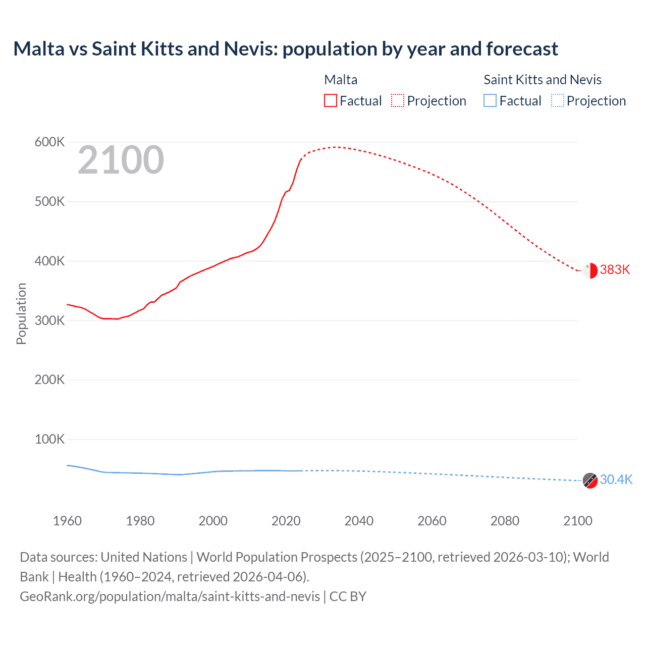 Malta vs Saint Kitts and Nevis: population by year and forecast