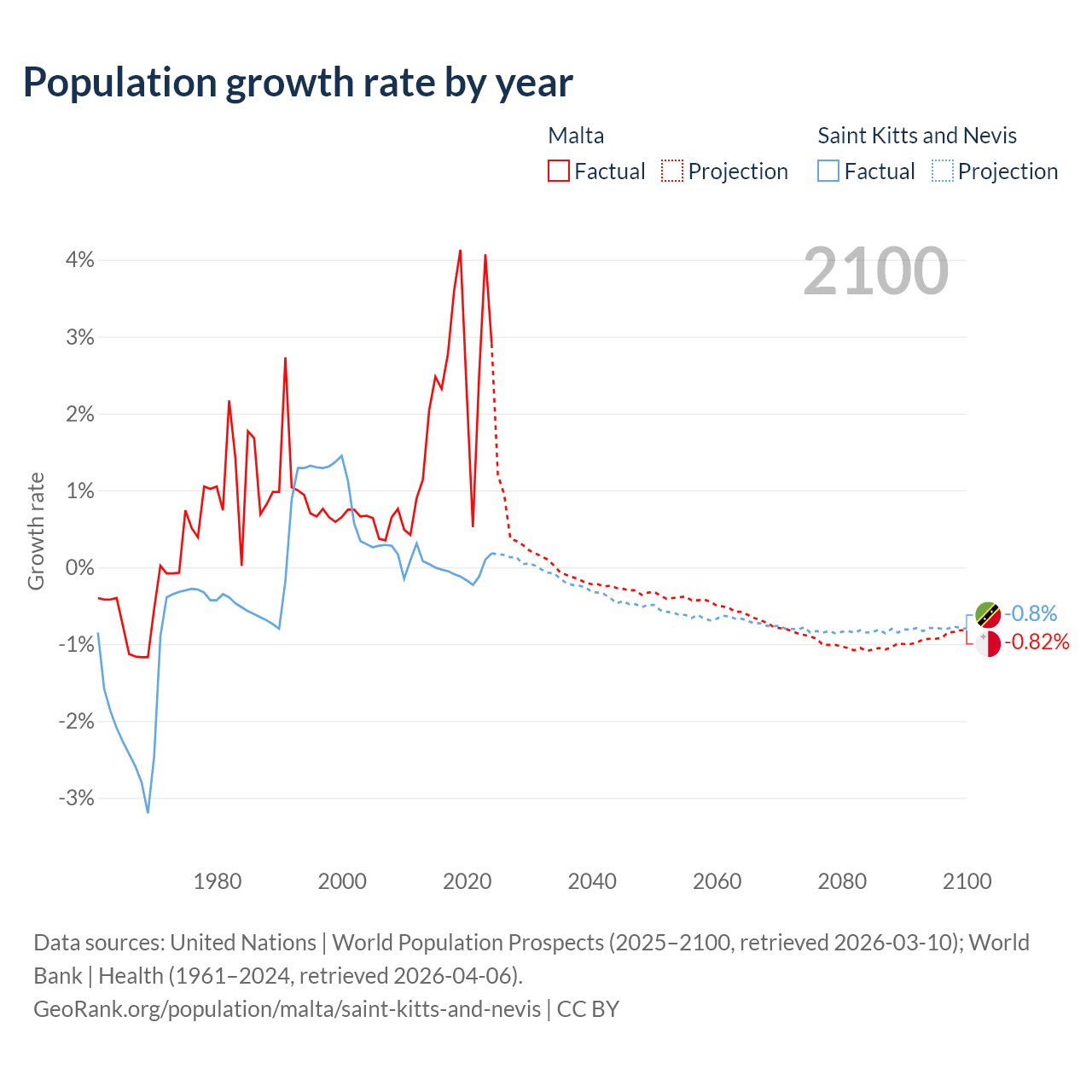 - For the last 10 years, Malta has had an average growth rate of +2.69% per year vs -0.04% in Saint Kitts and Nevis.