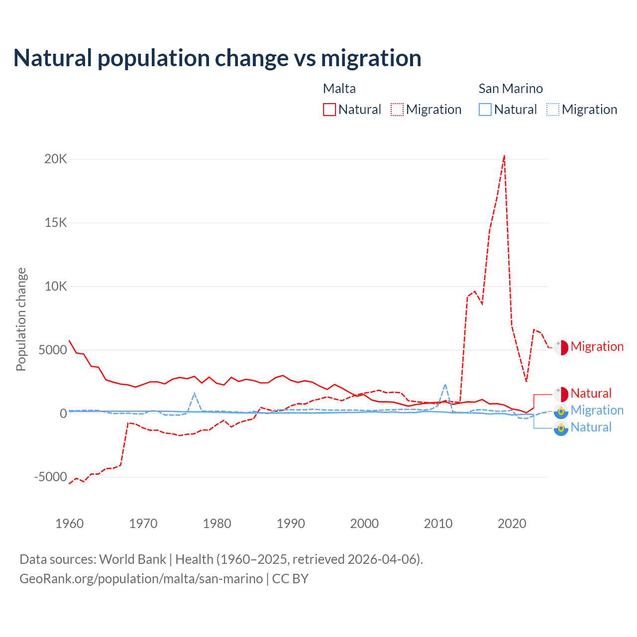 Over the last 10 years, 5.84% of the population change in Malta is from natural causes (a gain of 6,181 people) and 94.2% is from migration (a gain of 99,652 people). In San Marino 40.9% is from natural causes (a loss of 358 people) and 59.1% is from migration (a gain of 517 people).