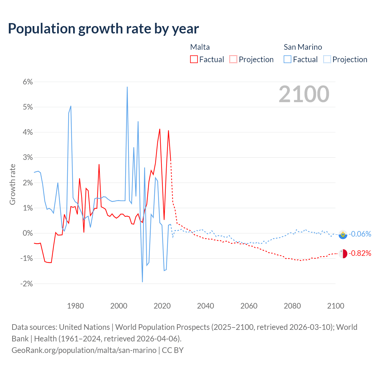 Data sources: World Bank | Health (1960–2024, retrieved 2026-04-06); United Nations | World Population Prospects (1960–2026, retrieved 2026-03-10); U.S. Census Bureau (1960–2025, retrieved 2026-02-08); Central Intelligence Agency (CIA) (2000–2019, retrieved 2026-02-20).