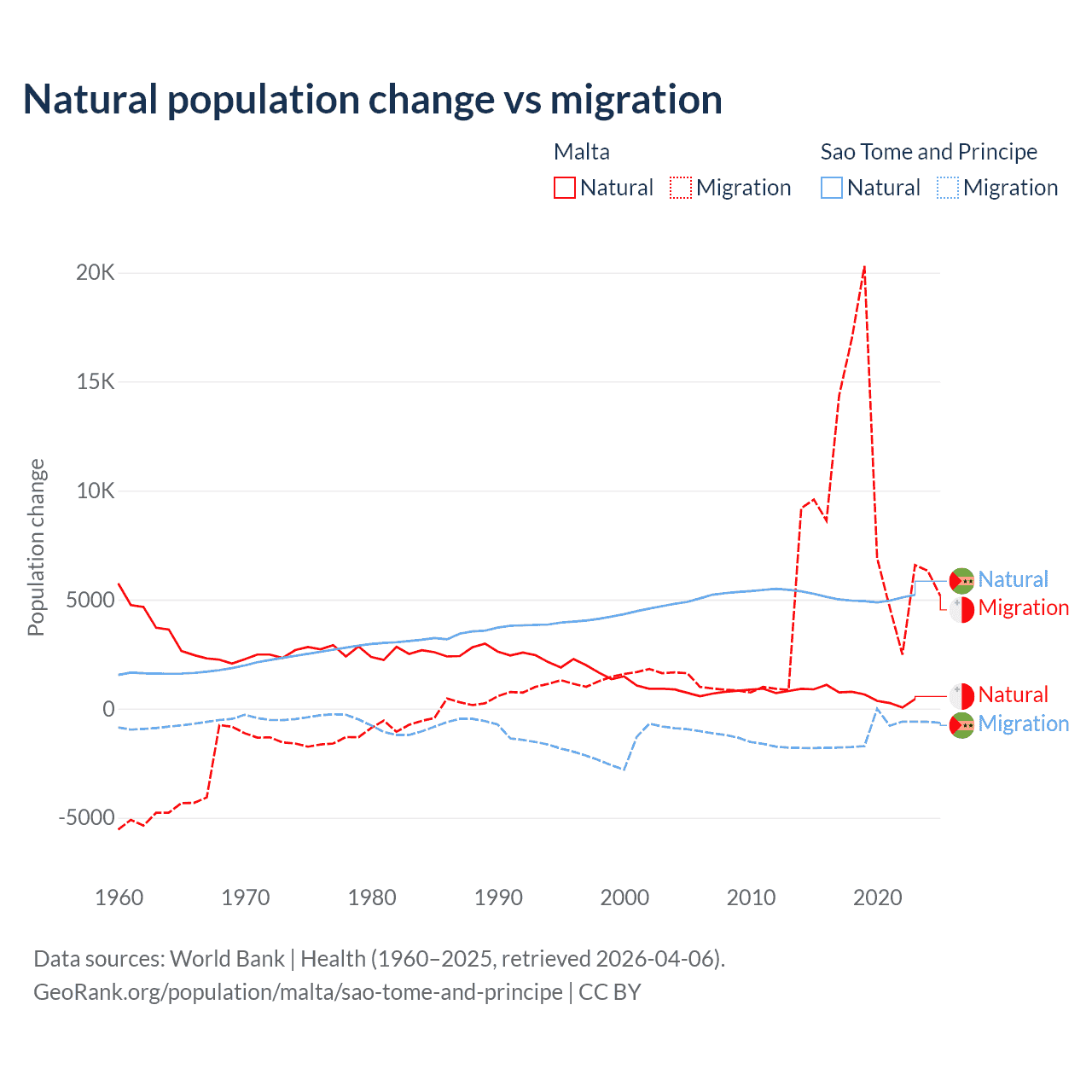 Over the last 10 years, 5.84% of the population change in Malta is from natural causes (a gain of 6,181 people) and 94.2% is from migration (a gain of 99,652 people). In Sao Tome and Principe 80.1% is from natural causes (a gain of 50,822 people) and 19.9% is from migration (a loss of 12,621 people).