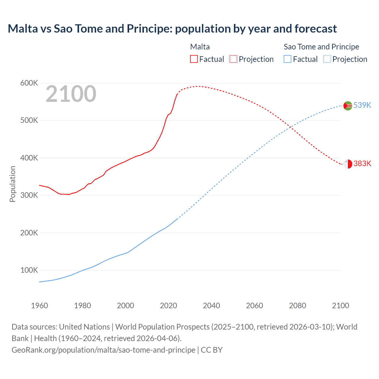 Malta vs Sao Tome and Principe: population by year and forecast
