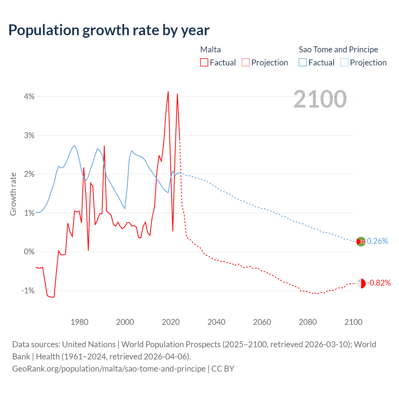 - For the last 10 years, Malta has had an average growth rate of +2.69% per year vs +1.82% in Sao Tome and Principe.