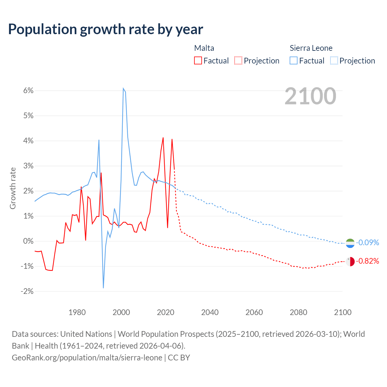 - For the last 10 years, Malta has had an average growth rate of +2.69% per year vs +2.32% in Sierra Leone.