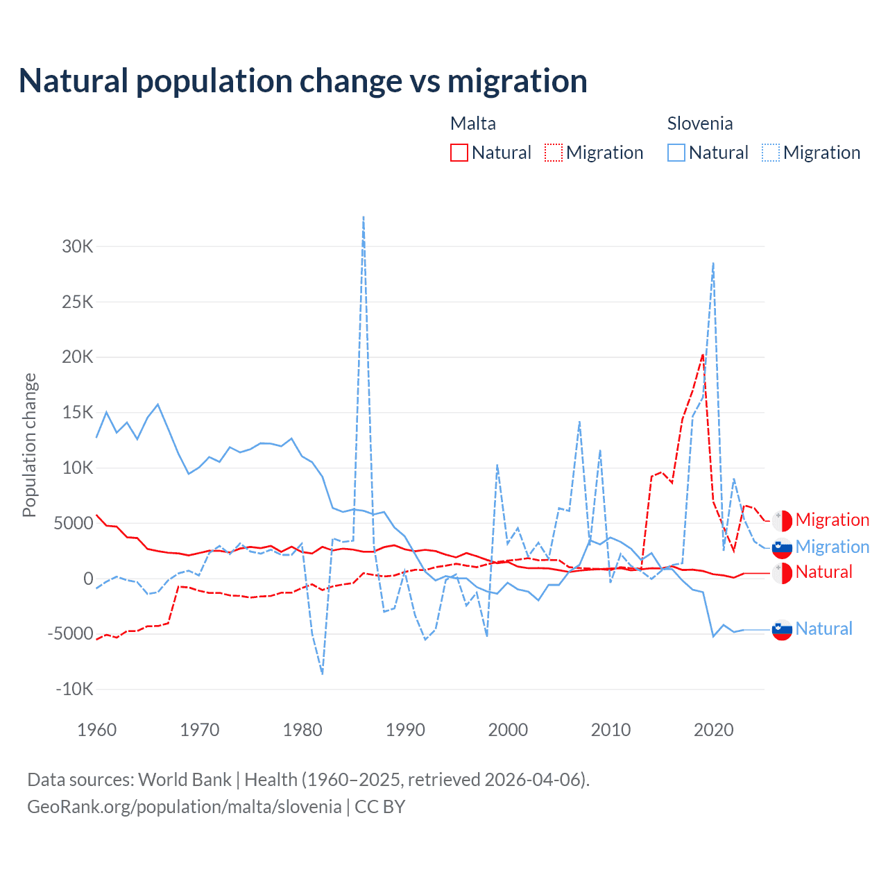 Over the last 10 years, 5.84% of the population change in Malta is from natural causes (a gain of 6,181 people) and 94.2% is from migration (a gain of 99,652 people). In Slovenia 18.1% is from natural causes (a loss of 17,573 people) and 81.9% is from migration (a gain of 79,532 people).