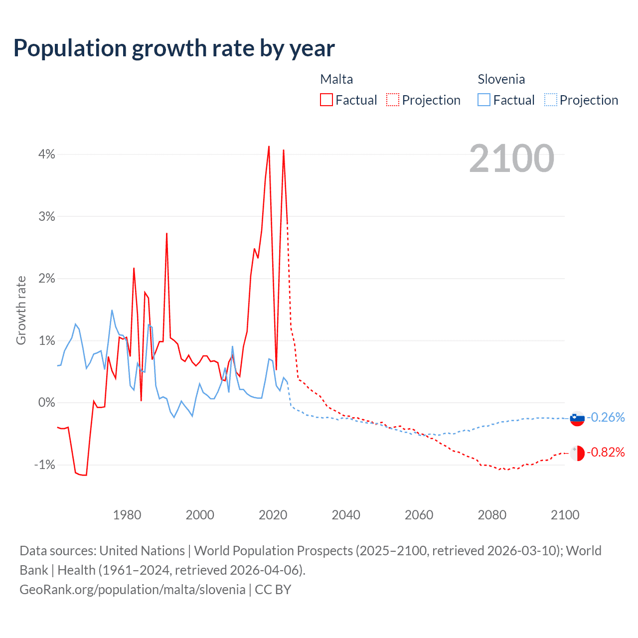 - For the last 10 years, Malta has had an average growth rate of +2.69% per year vs +0.29% in Slovenia.