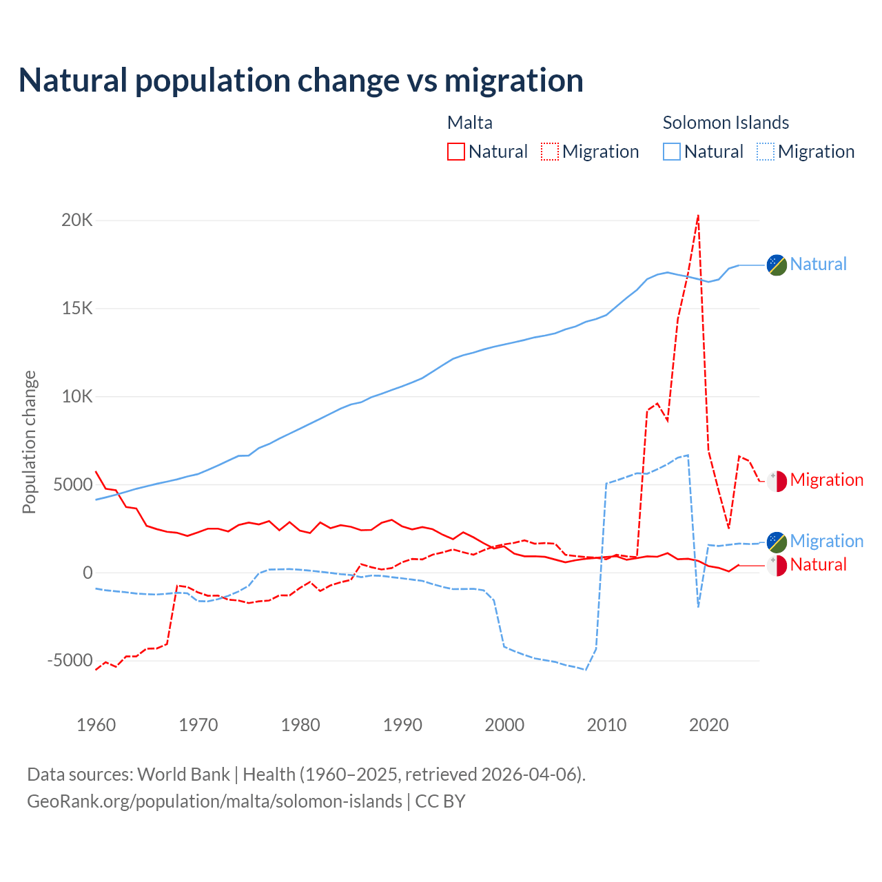 Over the last 10 years, 5.84% of the population change in Malta is from natural causes (a gain of 6,181 people) and 94.2% is from migration (a gain of 99,652 people). In the Solomon Islands 82.8% is from natural causes (a gain of 168,727 people) and 17.2% is from migration (a gain of 35,031 people).