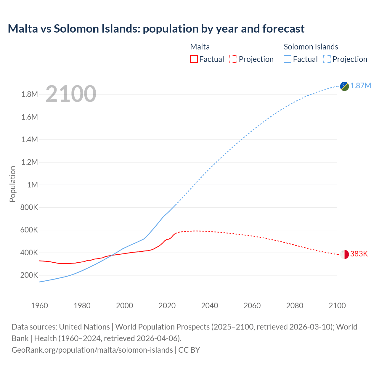 The latest officially reported population of Malta was 568,847 in 2024 vs 819,198 people in the Solomon Islands in 2024. In 2026, based on the adjusted UN estimation, the current Malta's population is 581,729 people compared to 863,951 in the Solomon Islands.