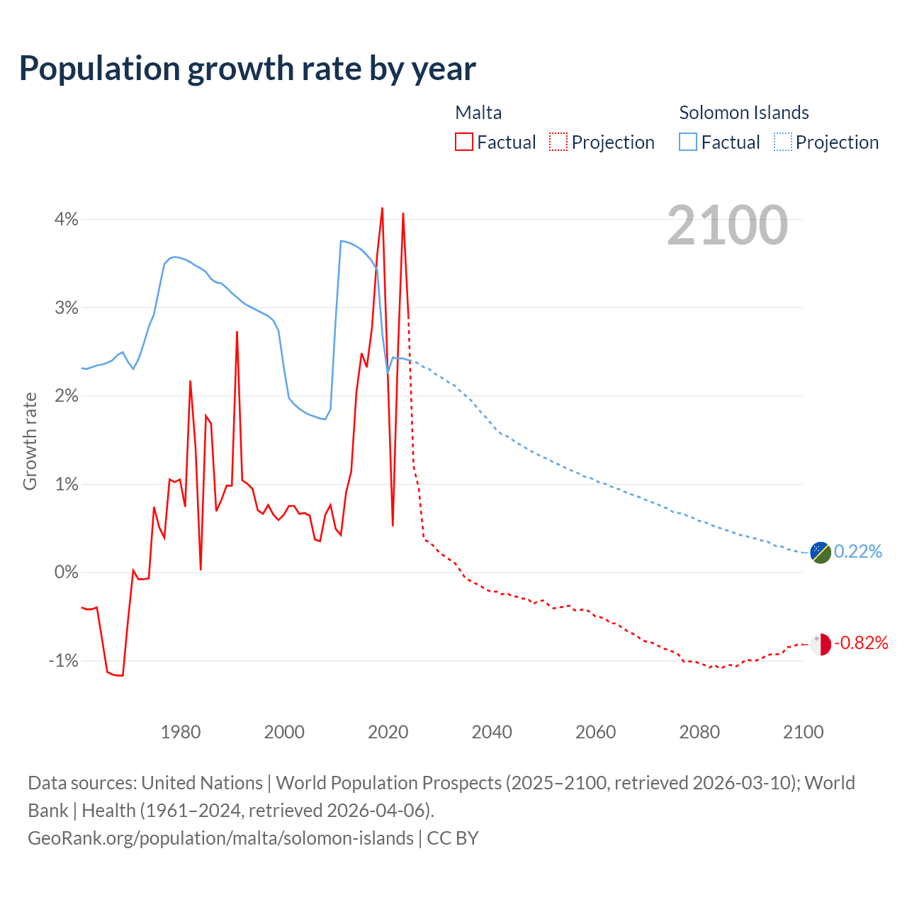 - For the last 10 years, Malta has had an average growth rate of +2.69% per year vs +2.95% in the Solomon Islands.