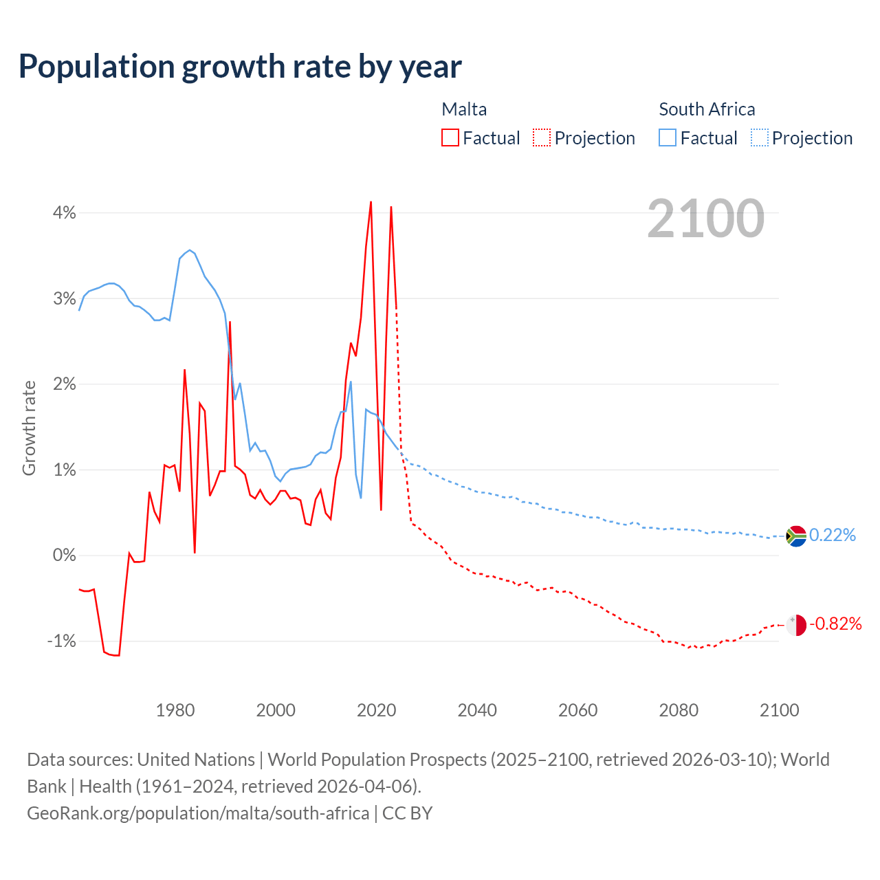 - For the last 10 years, Malta has had an average growth rate of +2.69% per year vs +1.44% in South Africa.