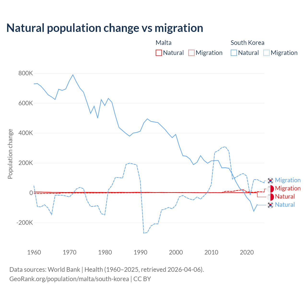 Over the last 10 years, 5.84% of the population change in Malta is from natural causes (a gain of 6,181 people) and 94.2% is from migration (a gain of 99,652 people). In South Korea 17.6% is from natural causes (a gain of 277,215 people) and 82.4% is from migration (a gain of 1,298,356 people).