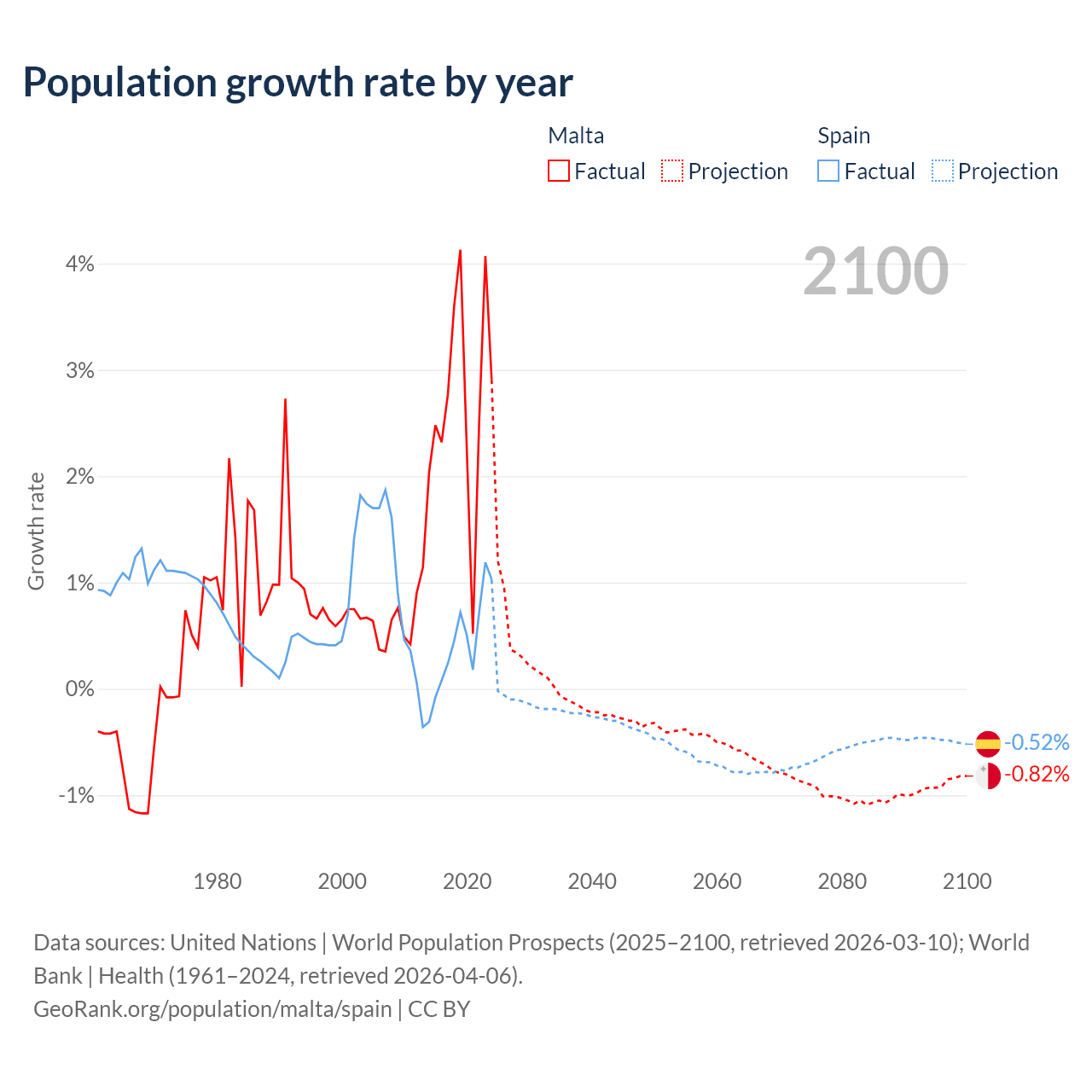- For the last 10 years, Malta has had an average growth rate of +2.69% per year vs +0.43% in Spain.