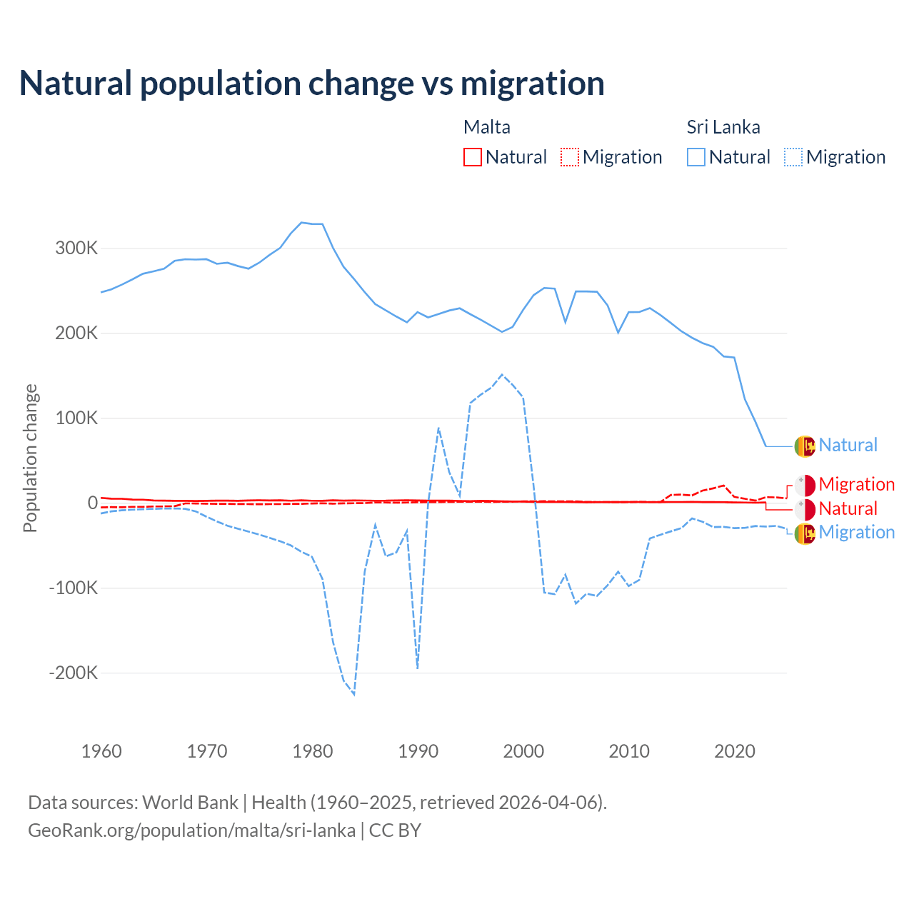 Over the last 10 years, 5.84% of the population change in Malta is from natural causes (a gain of 6,181 people) and 94.2% is from migration (a gain of 99,652 people). In Sri Lanka 85.3% is from natural causes (a gain of 1,605,749 people) and 14.7% is from migration (a loss of 276,121 people).