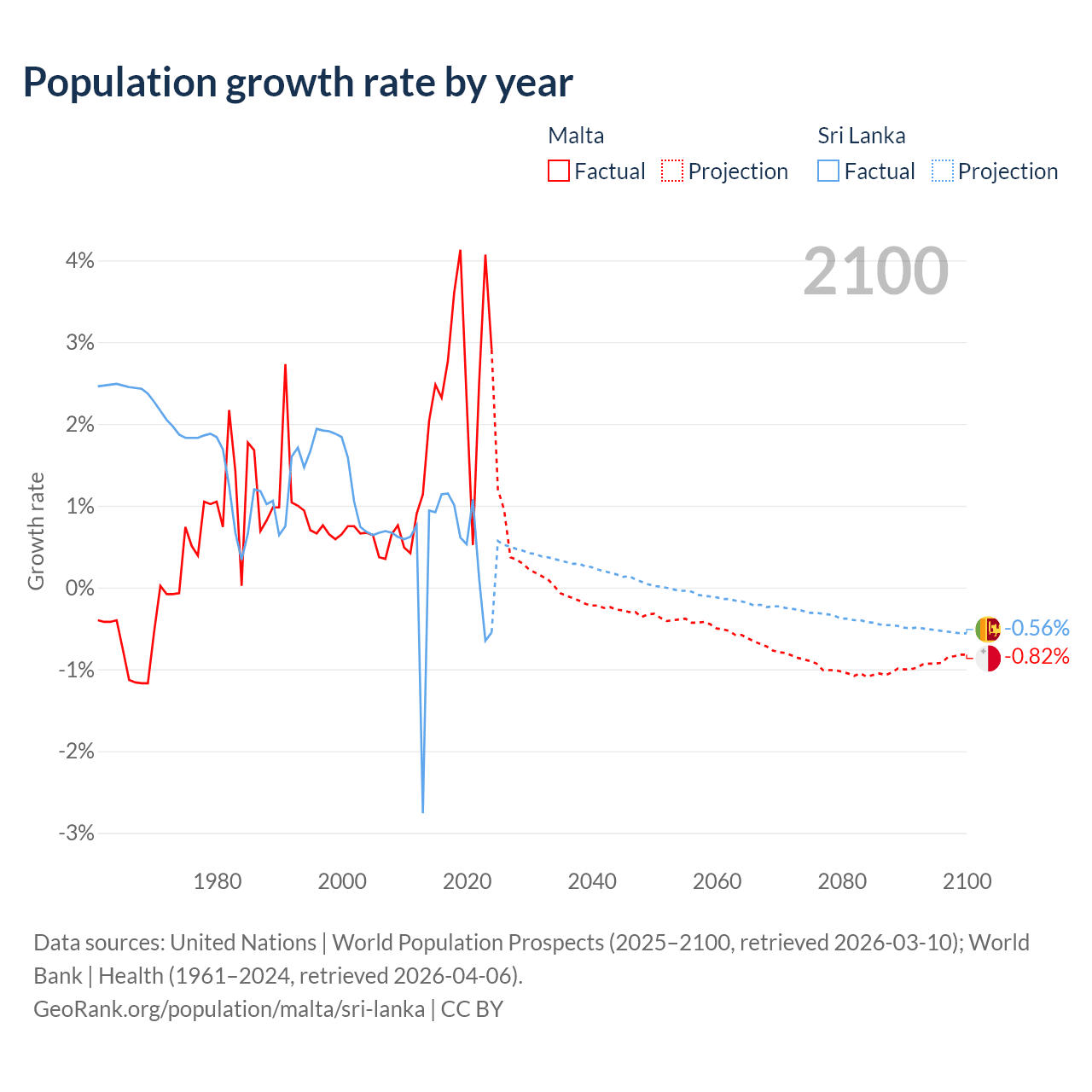 - For the last 10 years, Malta has had an average growth rate of +2.69% per year vs +0.57% in Sri Lanka.
