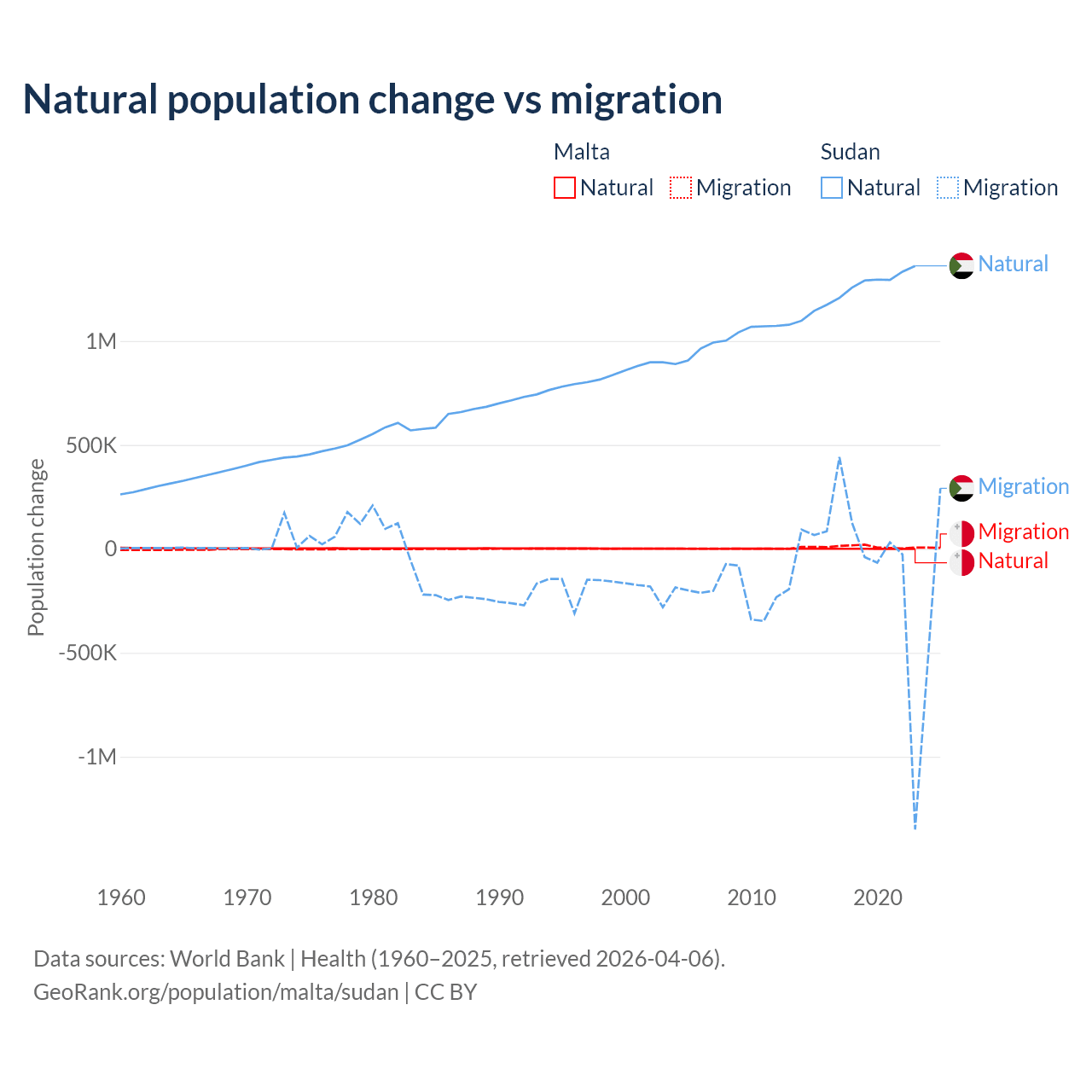 Over the last 10 years, 5.84% of the population change in Malta is from natural causes (a gain of 6,181 people) and 94.2% is from migration (a gain of 99,652 people). In Sudan 95.1% is from natural causes (a gain of 12,459,977 people) and 4.88% is from migration (a loss of 639,596 people).
