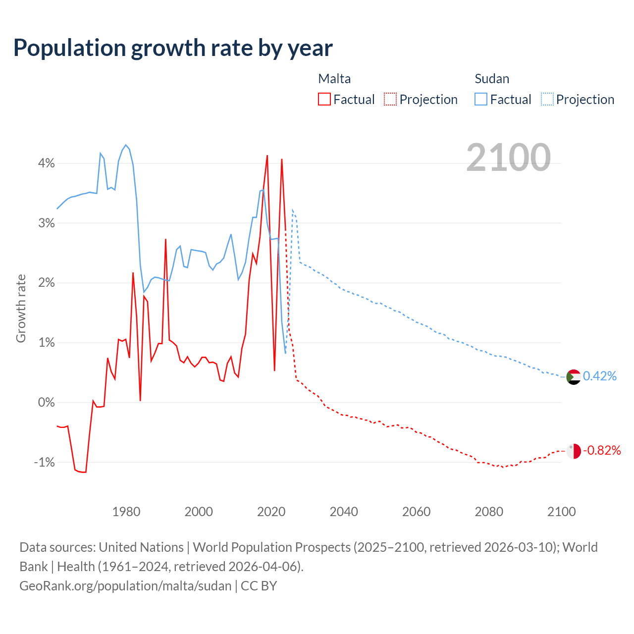 - For the last 10 years, Malta has had an average growth rate of +2.69% per year vs +2.67% in Sudan.