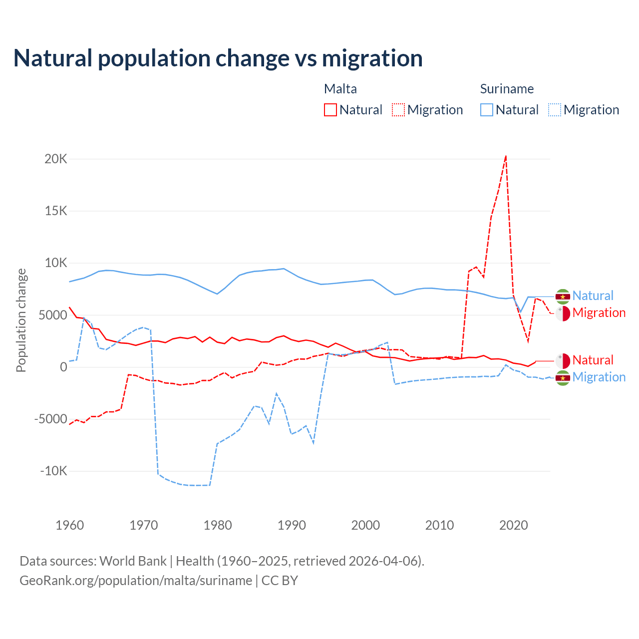 Over the last 10 years, 5.84% of the population change in Malta is from natural causes (a gain of 6,181 people) and 94.2% is from migration (a gain of 99,652 people). In Suriname 90.3% is from natural causes (a gain of 66,709 people) and 9.72% is from migration (a loss of 7,185 people).
