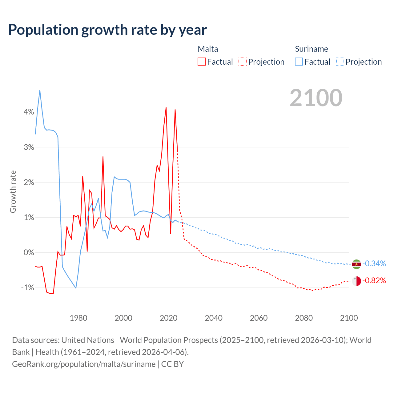 - For the last 10 years, Malta has had an average growth rate of +2.69% per year vs +0.99% in Suriname.