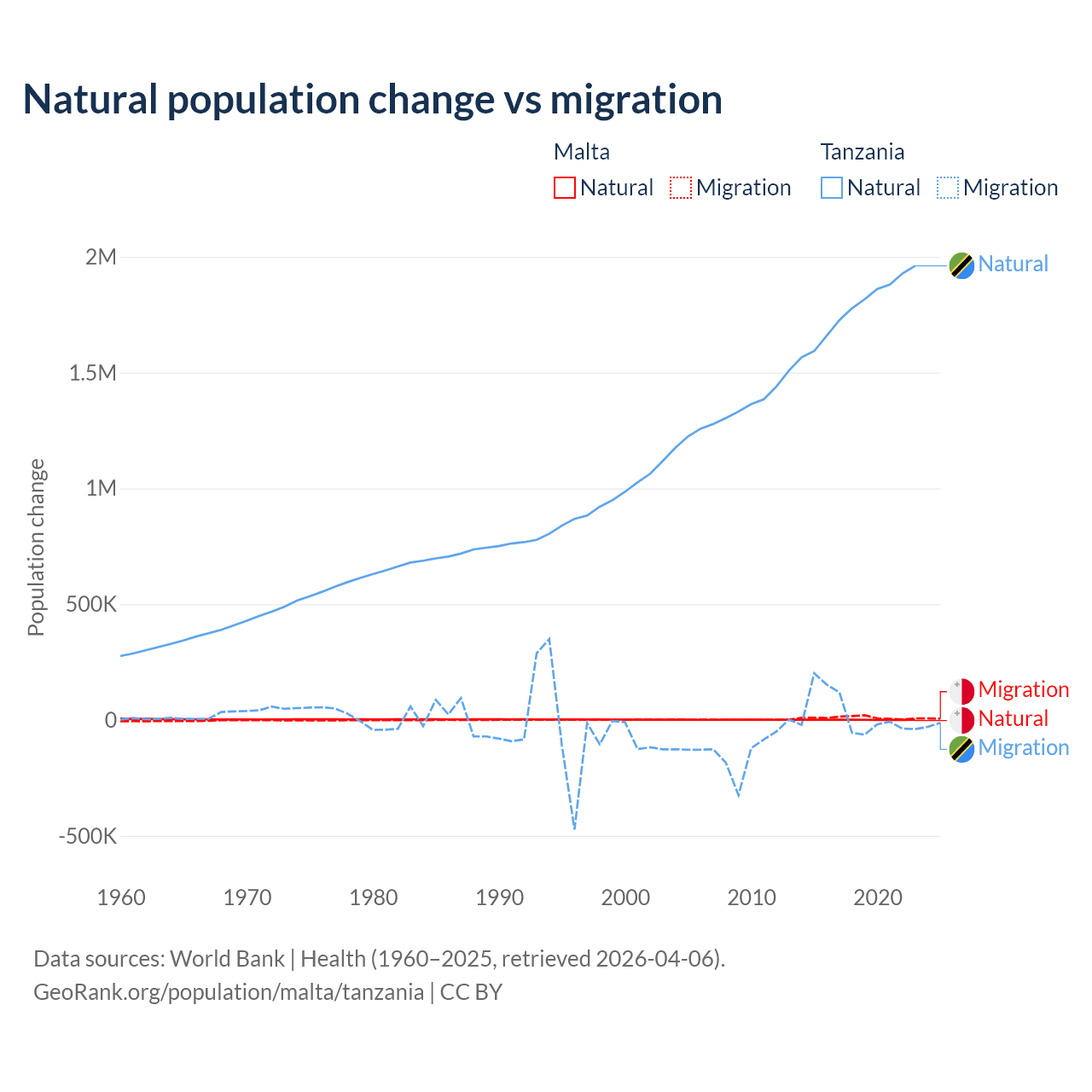 Over the last 10 years, 5.84% of the population change in Malta is from natural causes (a gain of 6,181 people) and 94.2% is from migration (a gain of 99,652 people). In Tanzania 98.7% is from natural causes (a gain of 17,769,541 people) and 1.27% is from migration (a gain of 229,466 people).