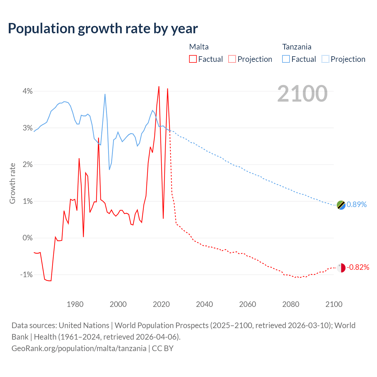 - For the last 10 years, Malta has had an average growth rate of +2.69% per year vs +3.13% in Tanzania.