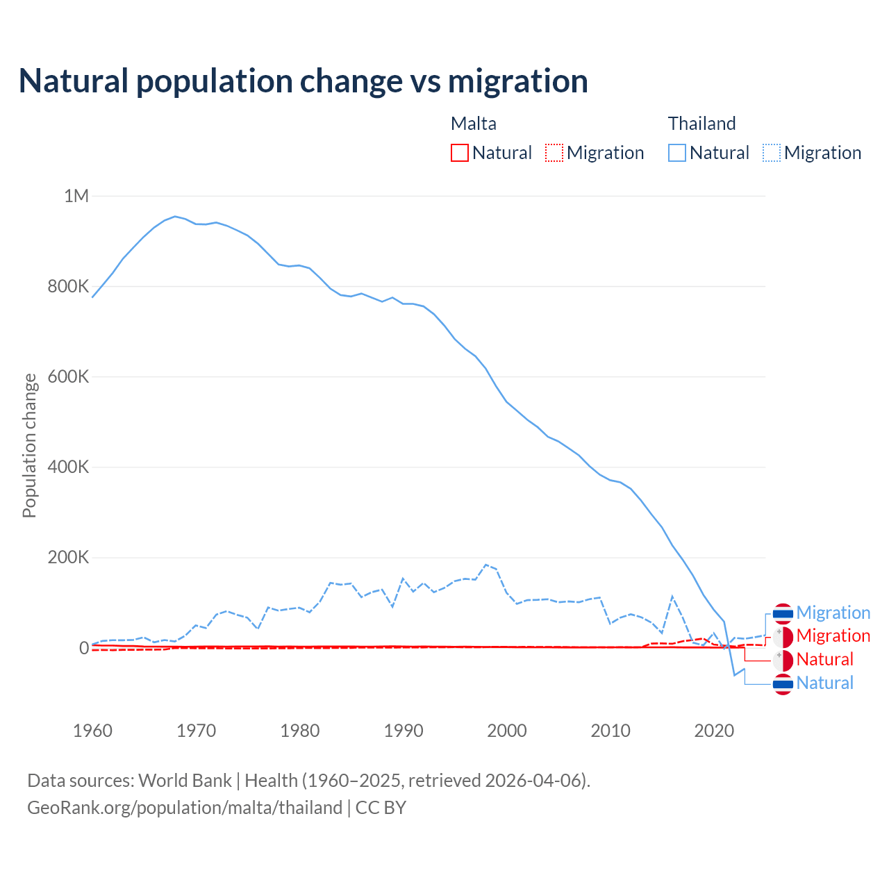 Over the last 10 years, 5.84% of the population change in Malta is from natural causes (a gain of 6,181 people) and 94.2% is from migration (a gain of 99,652 people). In Thailand 78.4% is from natural causes (a gain of 1,292,528 people) and 21.6% is from migration (a gain of 355,361 people).
