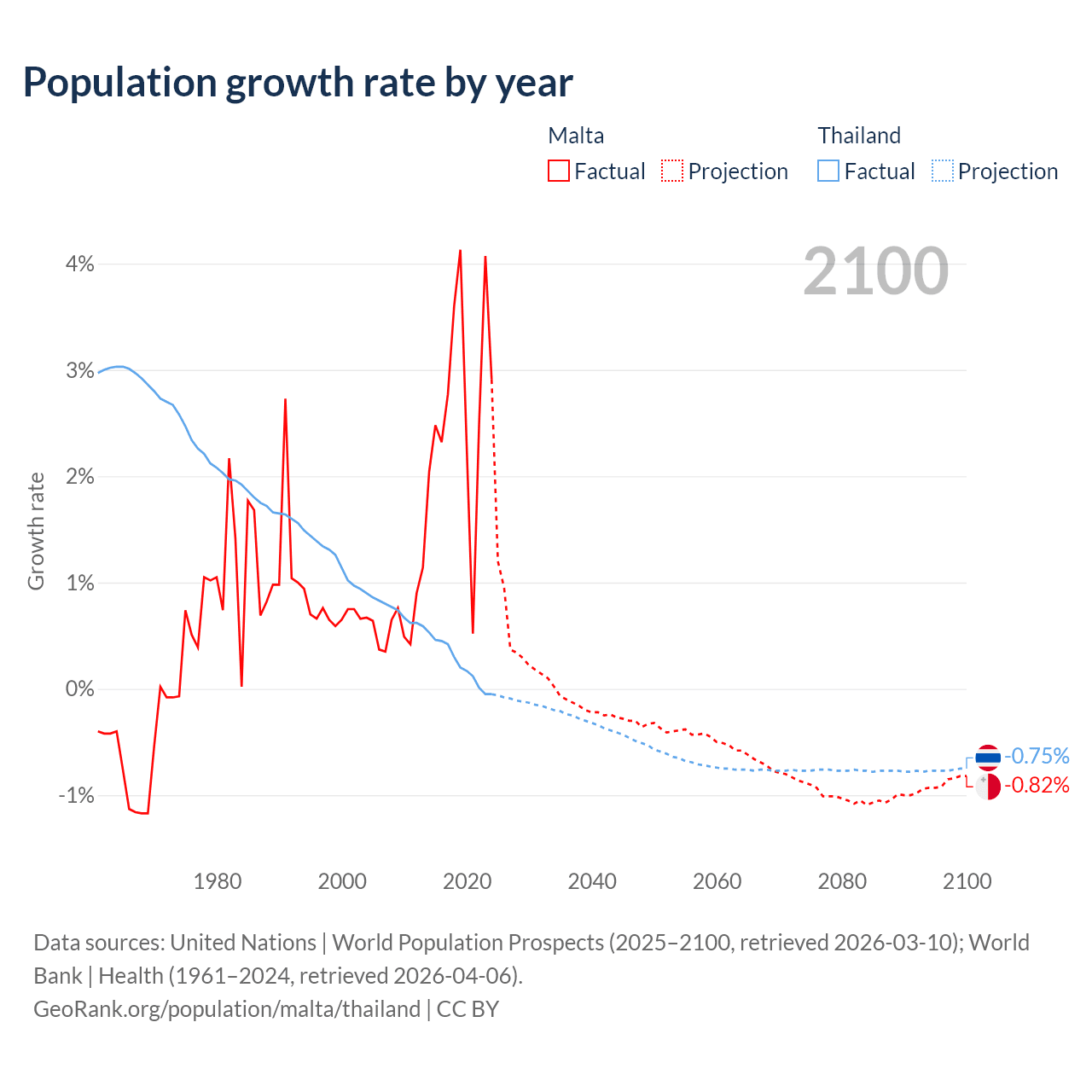 - For the last 10 years, Malta has had an average growth rate of +2.69% per year vs +0.23% in Thailand.