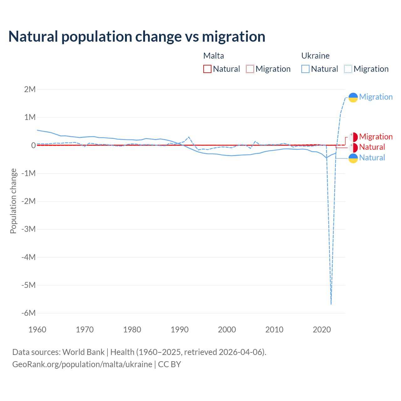 Over the last 10 years, 5.84% of the population change in Malta is from natural causes (a gain of 6,181 people) and 94.2% is from migration (a gain of 99,652 people). In Ukraine 28.2% is from natural causes (a loss of 2,435,153 people) and 71.8% is from migration (a loss of 6,198,995 people).