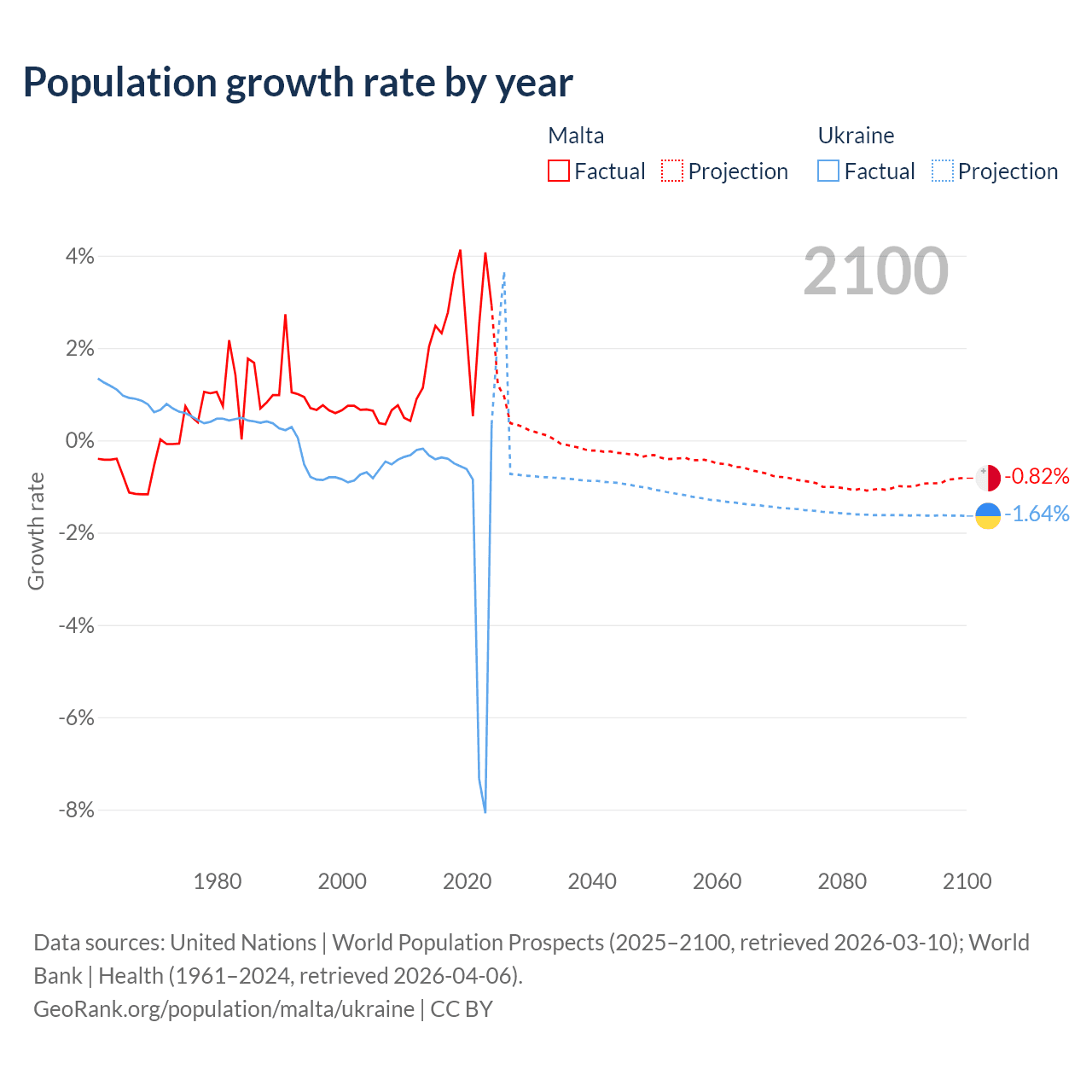 - For the last 10 years, Malta has had an average growth rate of +2.69% per year vs -1.74% in Ukraine.