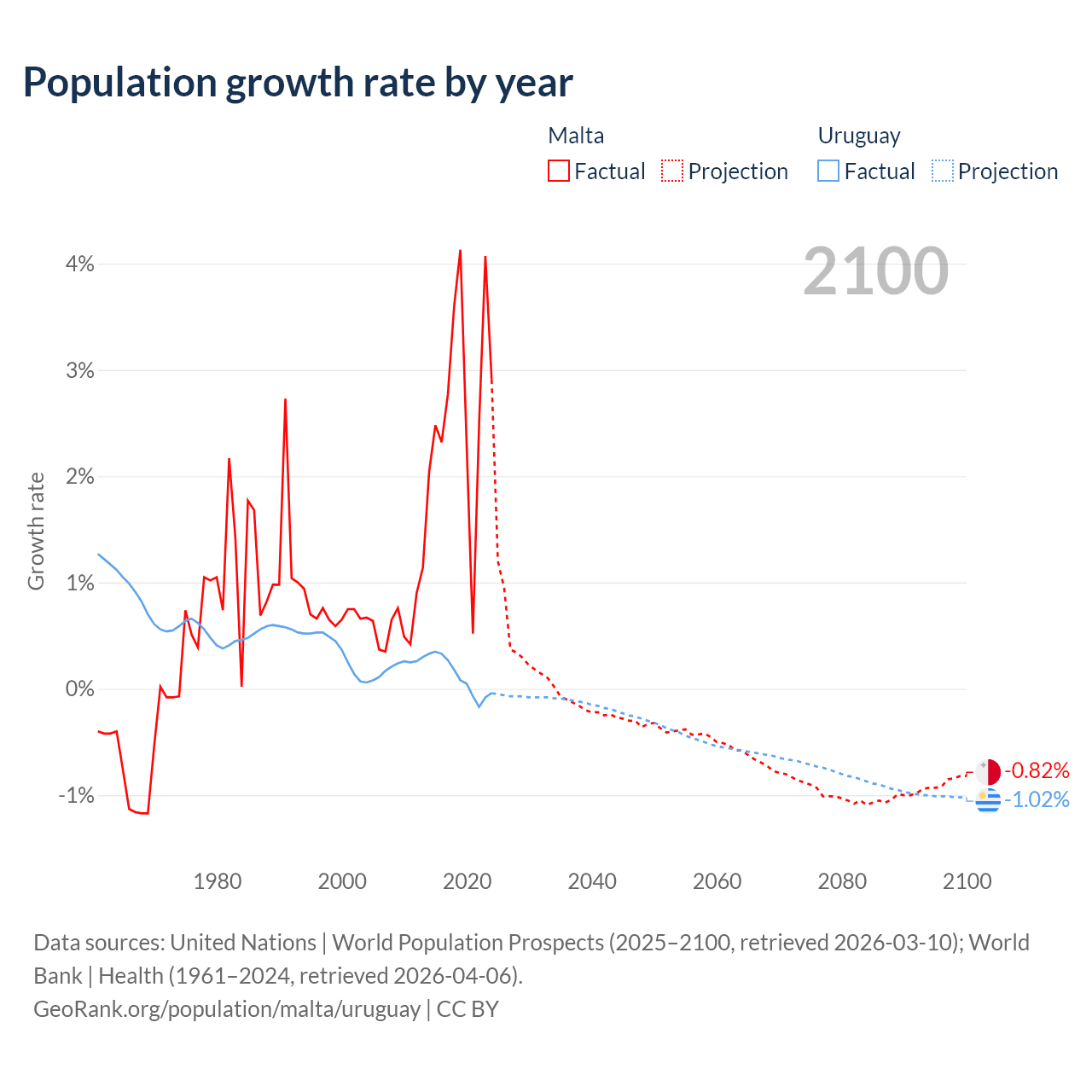 - For the last 10 years, Malta has had an average growth rate of +2.69% per year vs +0.11% in Uruguay.