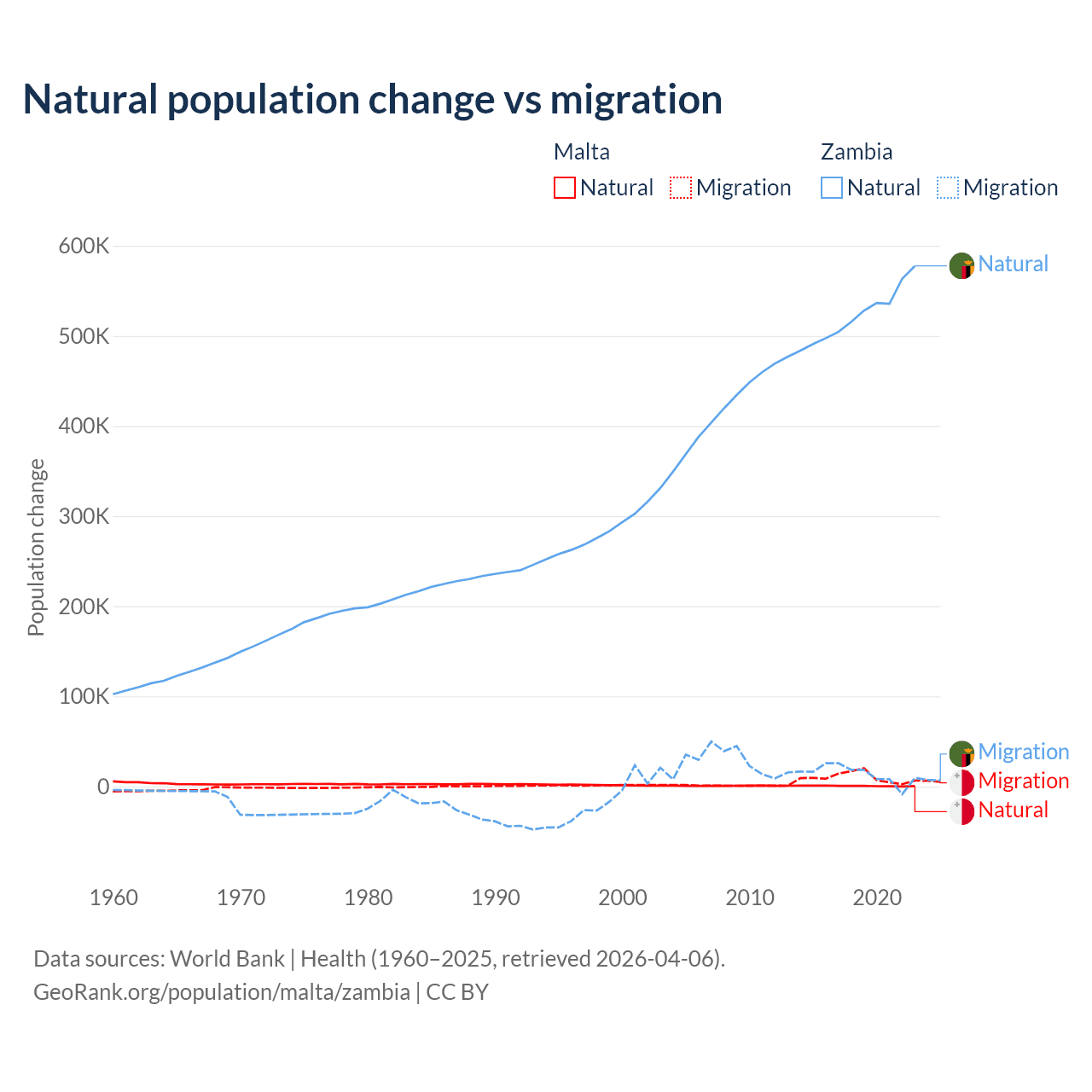 Over the last 10 years, 5.84% of the population change in Malta is from natural causes (a gain of 6,181 people) and 94.2% is from migration (a gain of 99,652 people). In Zambia 97.4% is from natural causes (a gain of 5,233,797 people) and 2.58% is from migration (a gain of 138,554 people).