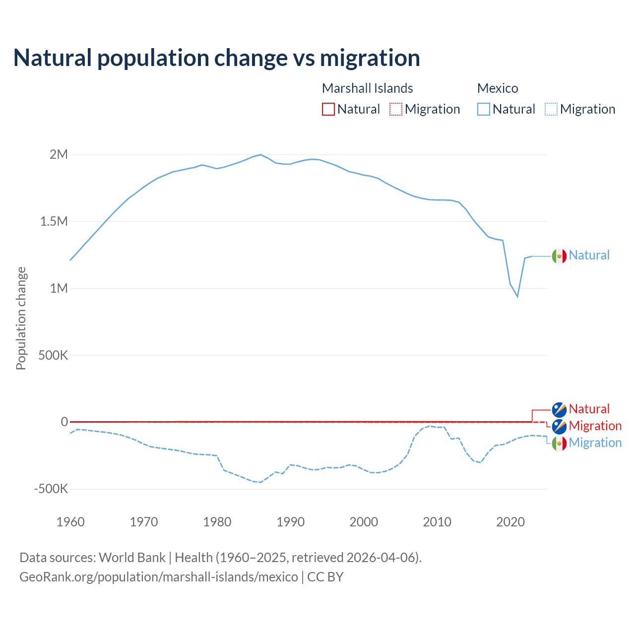 Over the last 10 years, 27.8% of the population change in the Marshall Islands is from natural causes (a gain of 7,592 people) and 72.2% is from migration (a loss of 19,682 people). In Mexico 87.5% is from natural causes (a gain of 13,080,136 people) and 12.5% is from migration (a loss of 1,876,544 people).
