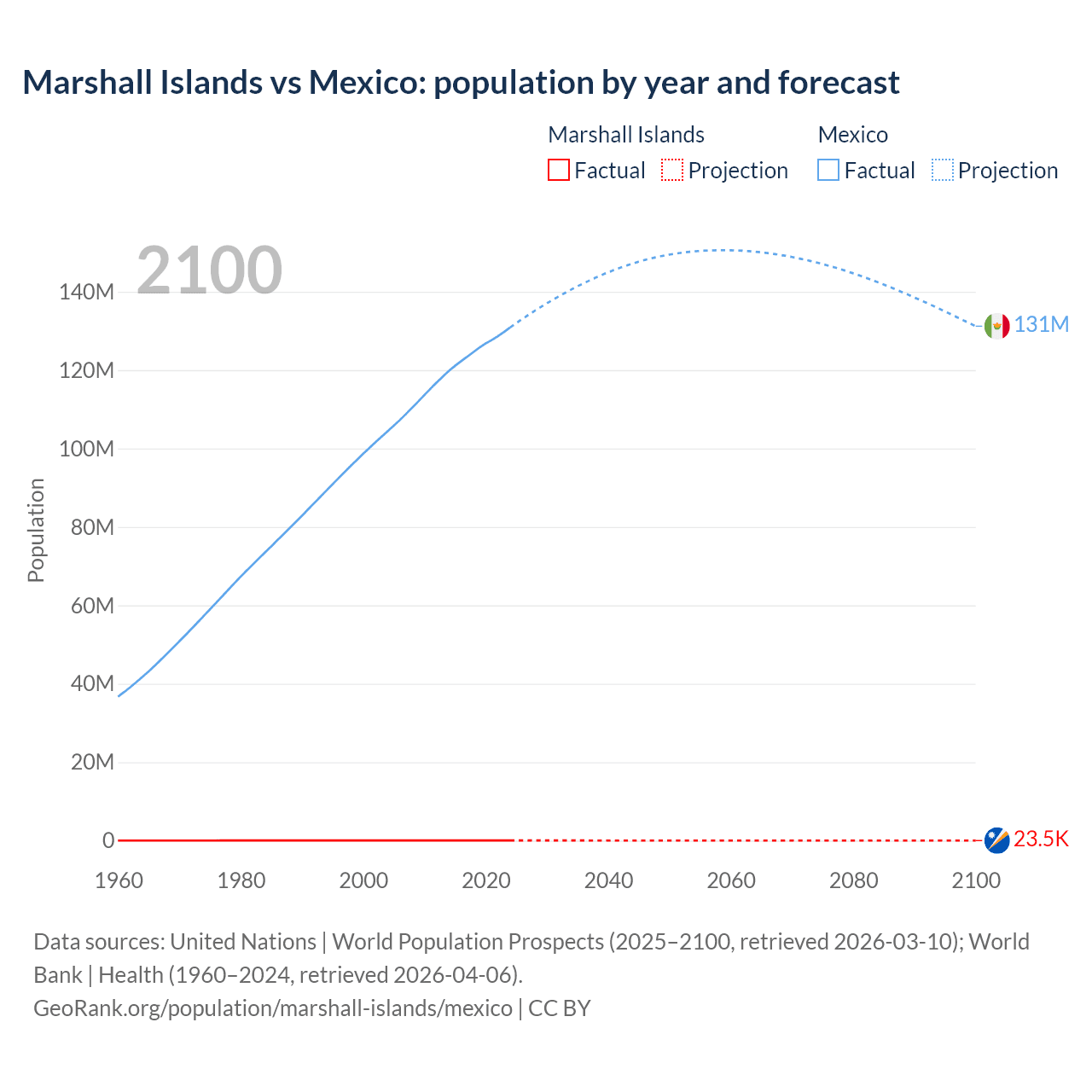 Marshall Islands vs Mexico: population by year and forecast