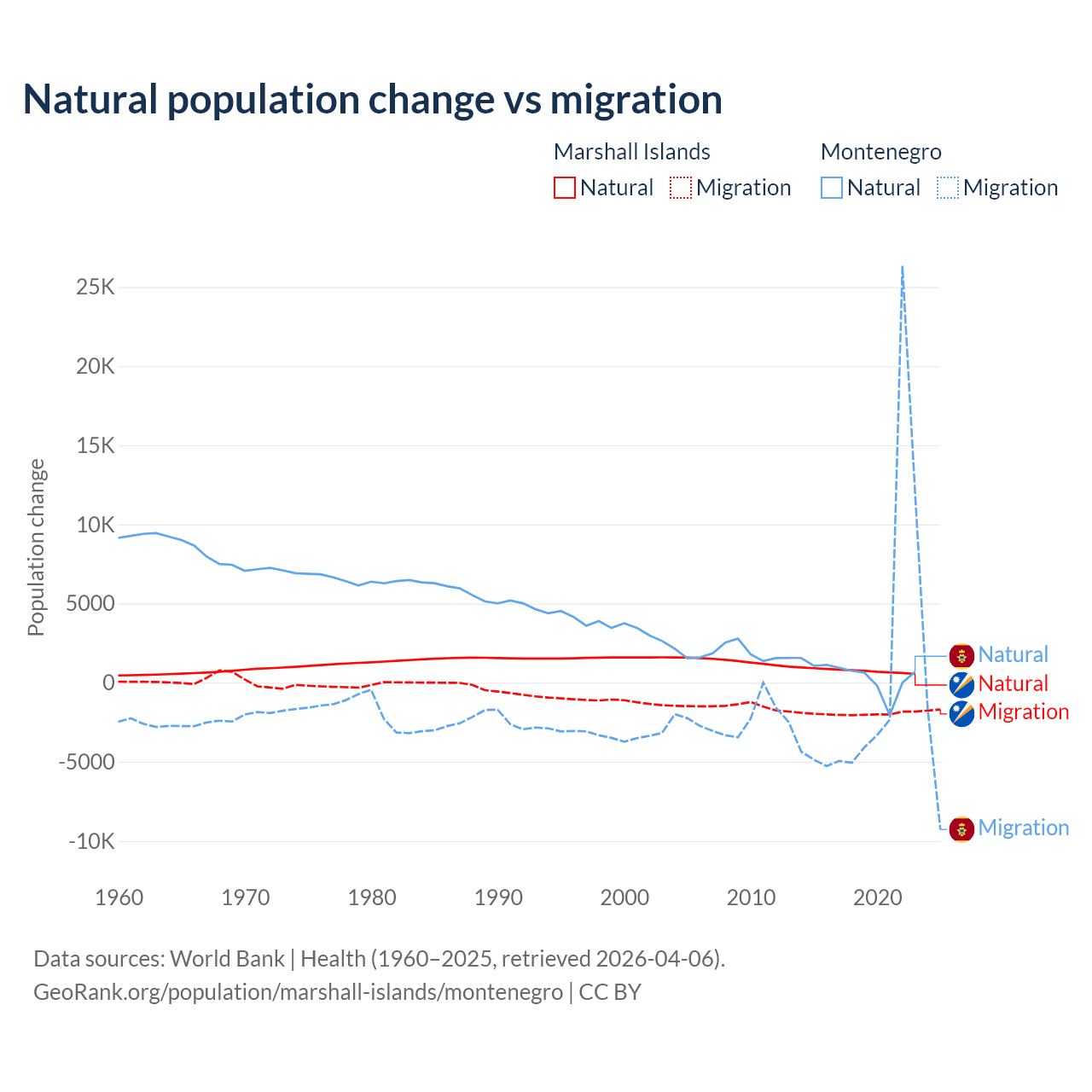 Over the last 10 years, 27.8% of the population change in the Marshall Islands is from natural causes (a gain of 7,592 people) and 72.2% is from migration (a loss of 19,682 people). In Montenegro 52.4% is from natural causes (a gain of 4,501 people) and 47.6% is from migration (a gain of 4,095 people).