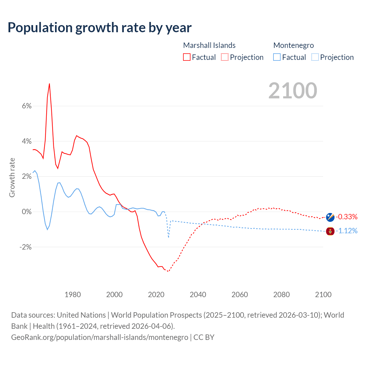 - For the last 10 years, the Marshall Islands has had an average growth rate of -2.69% per year vs +0.01% in Montenegro.