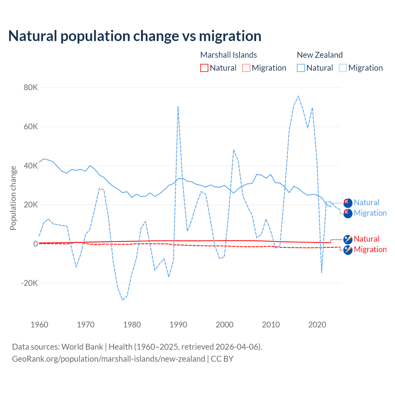 Over the last 10 years, 27.8% of the population change in the Marshall Islands is from natural causes (a gain of 7,592 people) and 72.2% is from migration (a loss of 19,682 people). In New Zealand 34.4% is from natural causes (a gain of 247,767 people) and 65.6% is from migration (a gain of 471,602 people).