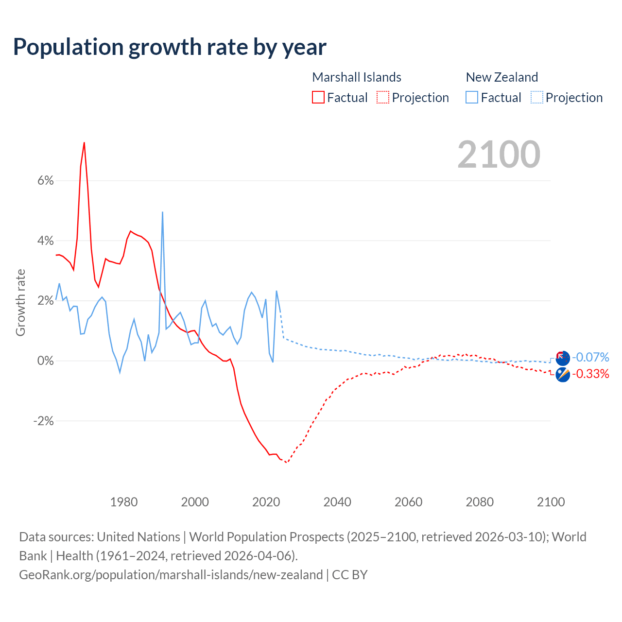 Marshall Islands vs New Zealand: population by year and forecast