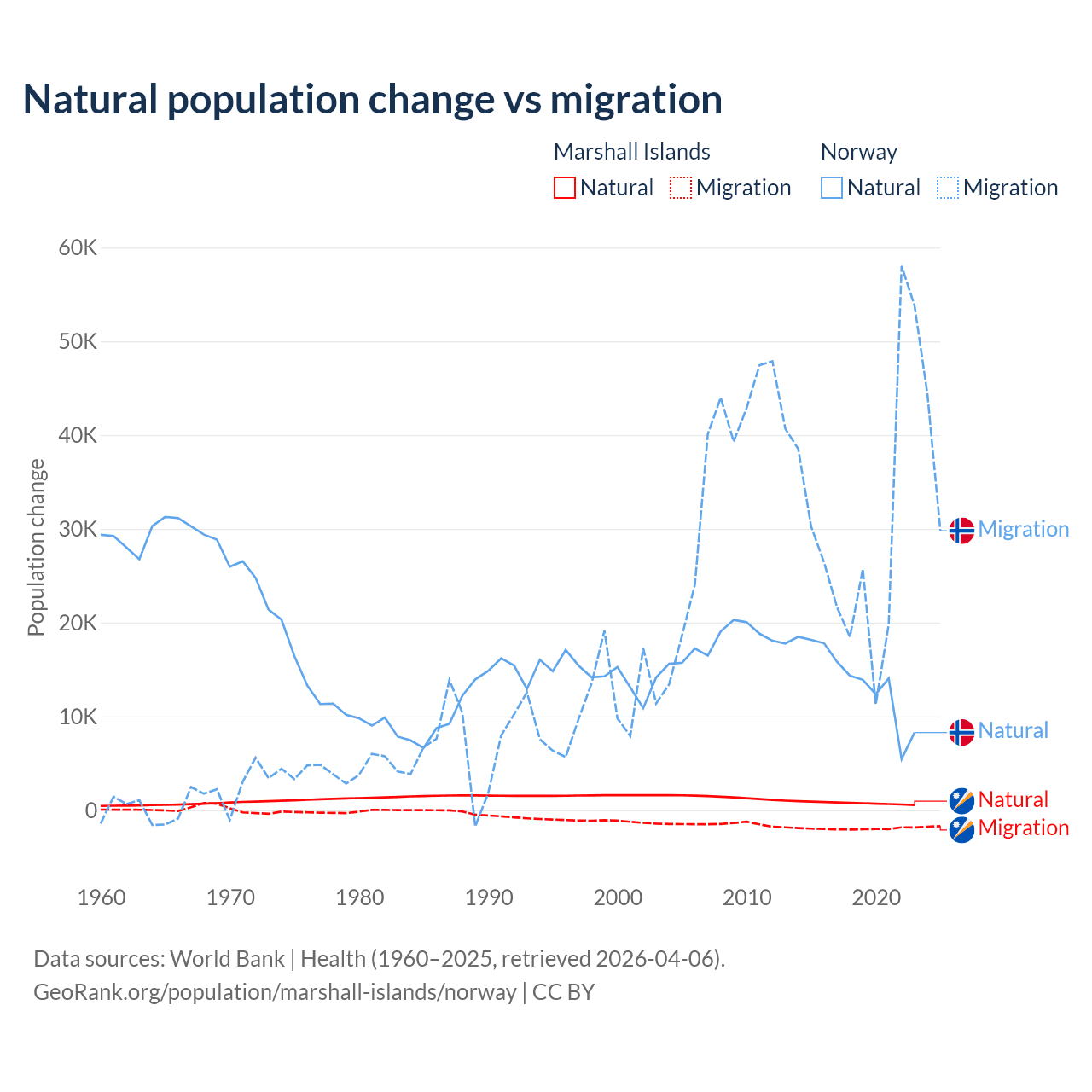 Over the last 10 years, 27.8% of the population change in the Marshall Islands is from natural causes (a gain of 7,592 people) and 72.2% is from migration (a loss of 19,682 people). In Norway 31.3% is from natural causes (a gain of 138,699 people) and 68.7% is from migration (a gain of 303,945 people).