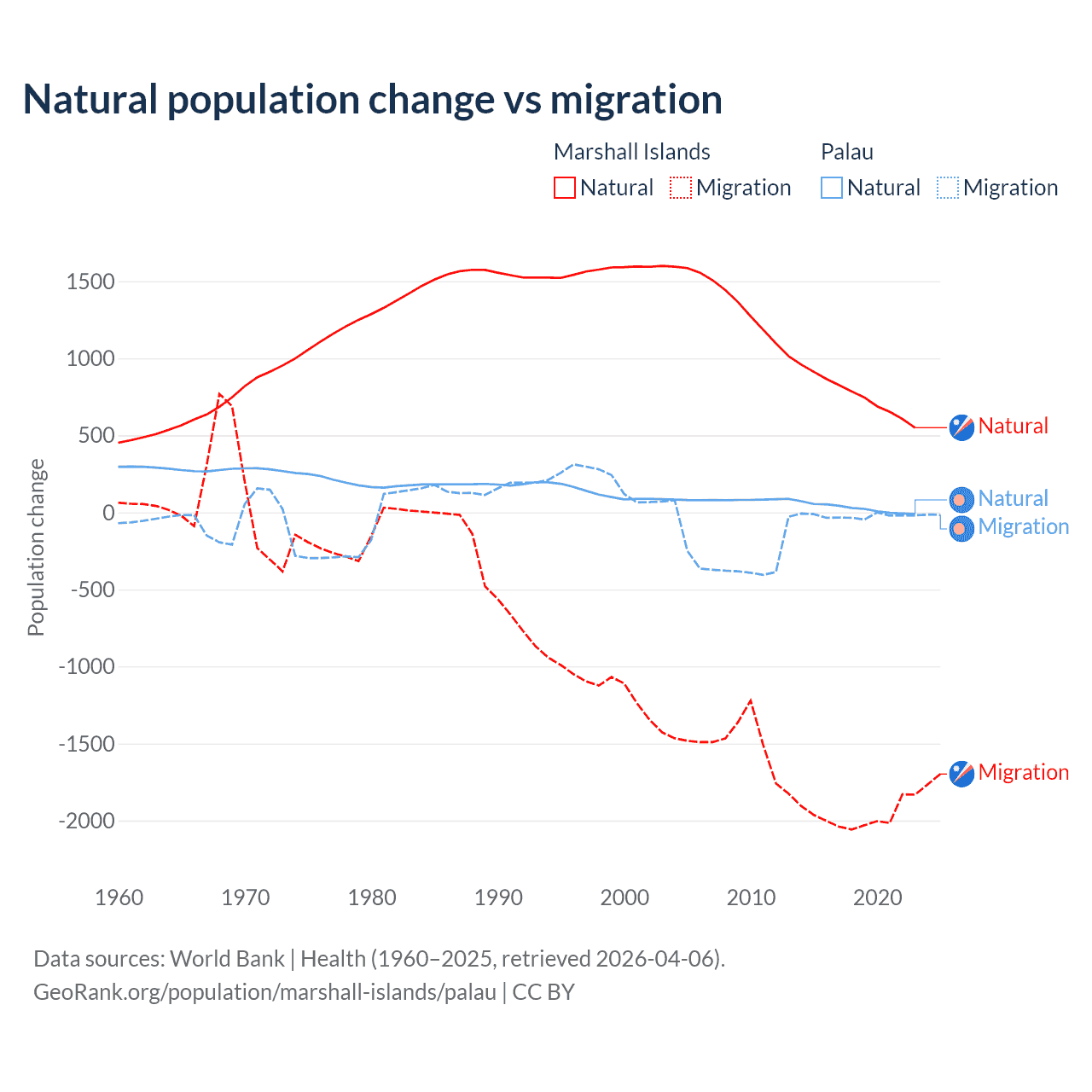Over the last 10 years, 27.8% of the population change in the Marshall Islands is from natural causes (a gain of 7,592 people) and 72.2% is from migration (a loss of 19,682 people). In Palau 53.8% is from natural causes (a gain of 264 people) and 46.2% is from migration (a loss of 227 people).