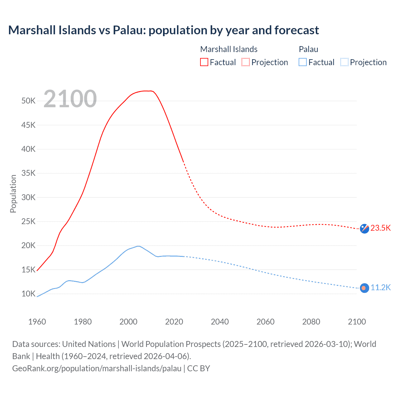- Since 2006, the population of the Marshall Islands has decreased from 52K people to 35.1K (32.6% decline), while Palau has declined from 19.6K to 17.6K (10% decline).