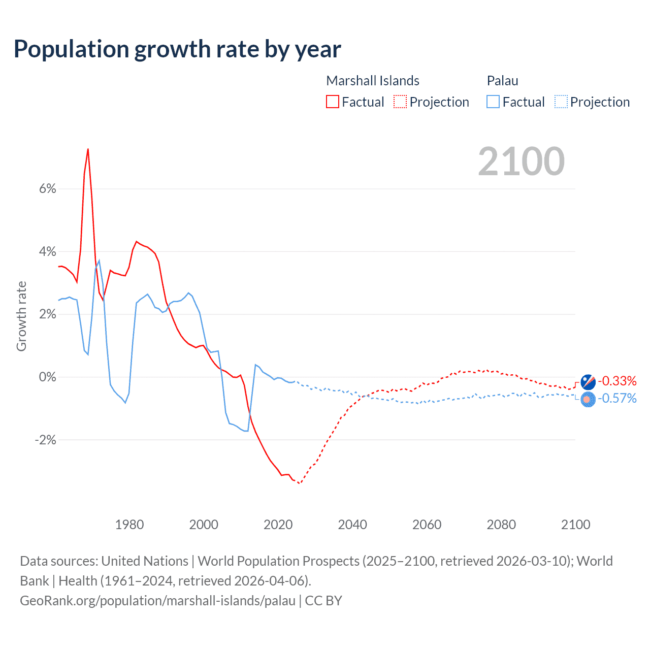 - For the last 10 years, the Marshall Islands has had an average growth rate of -2.69% per year vs +0.02% in Palau.